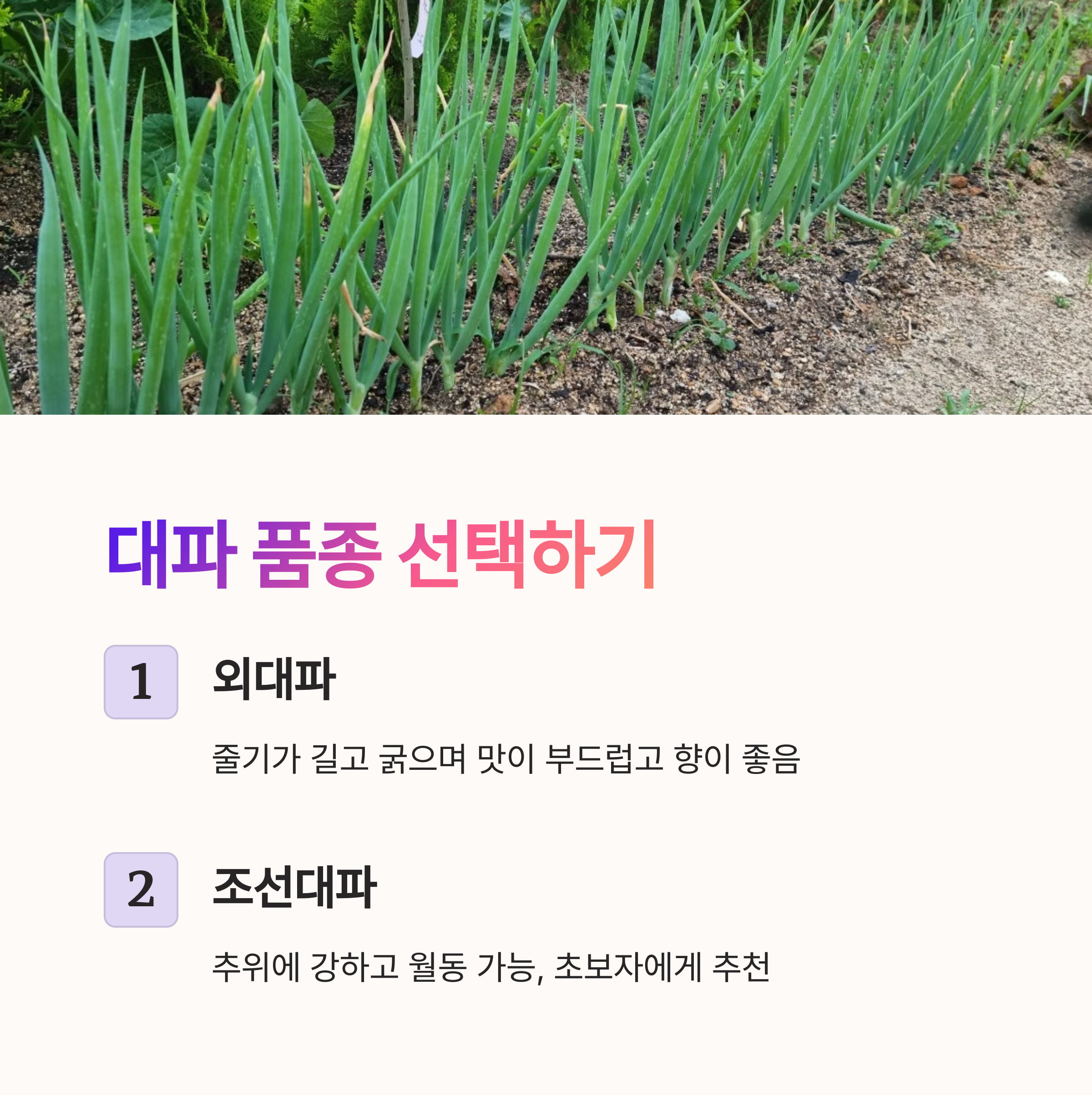 대파에는 크게 두 가지 품종이 있어요. 외대파와 조선대파인데, 각각의 특징을 알아두면 재배 계획을 세우는 데 도움이 됩니다.