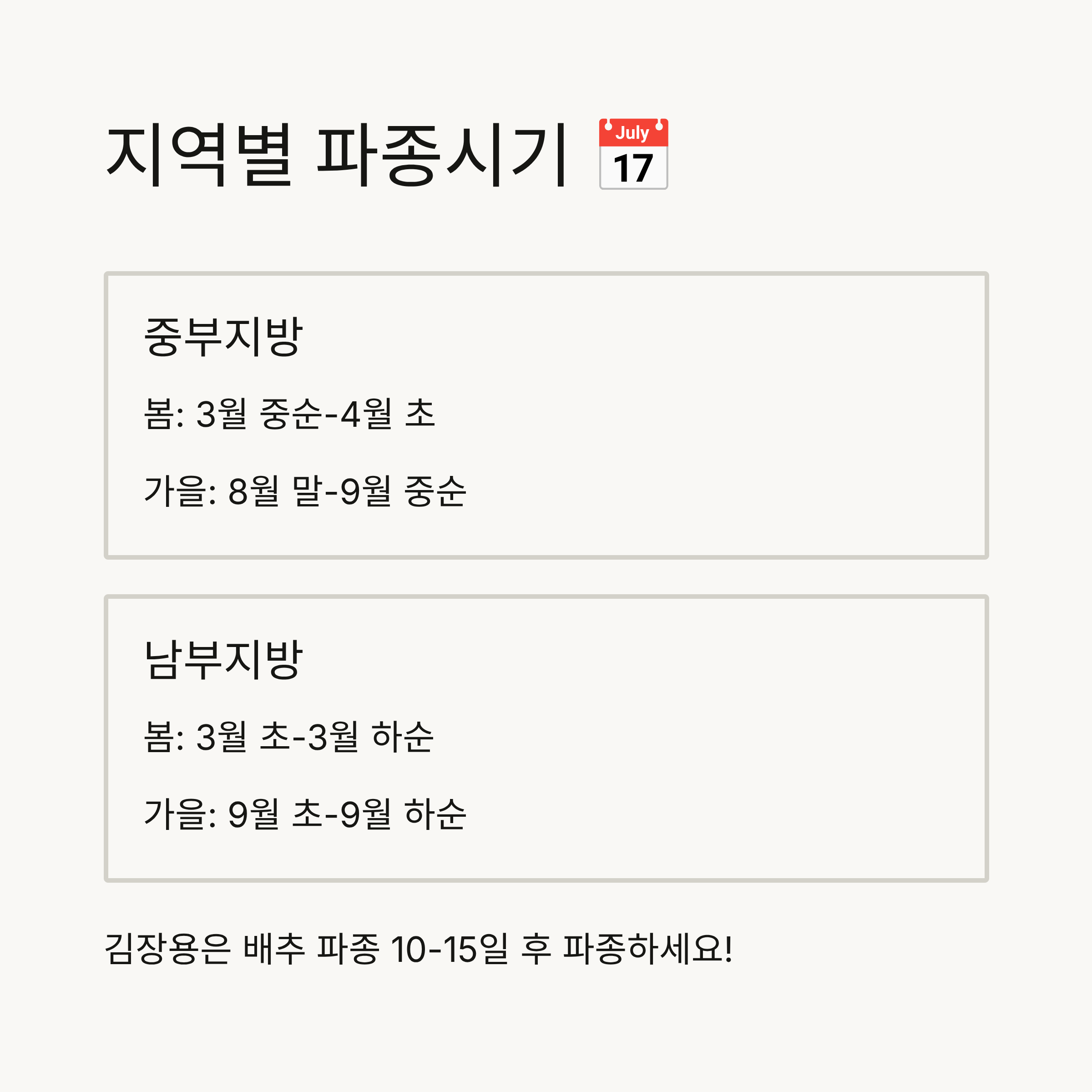 알타리무 파종시기는 지역과 계절에 따라 달라집니다. 전국적으로 봄과 가을 재배가 주를 이루며, 김장철에 맞춘 가을 파종이 특히 인기죠. 아래 표는 지역별 파종 및 수확 시기를 정리한 것입니다.