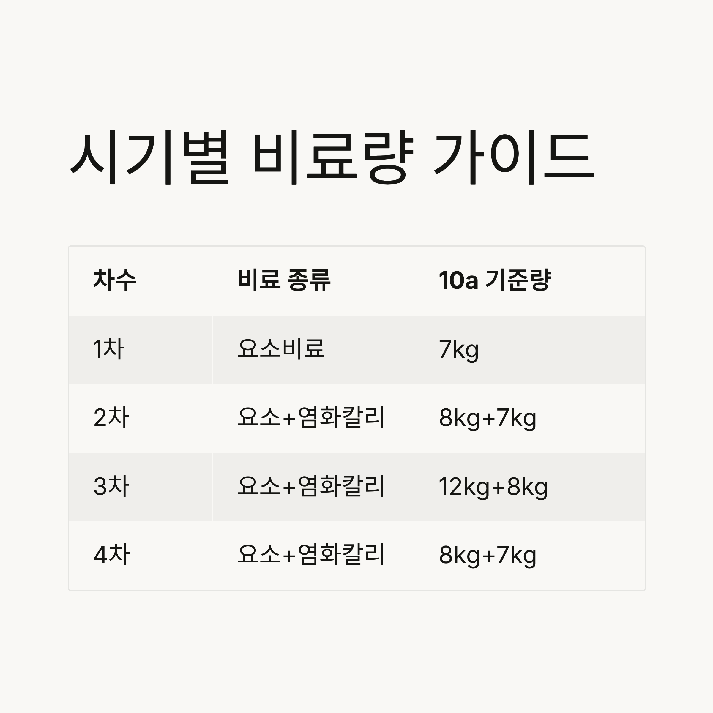 | 3차: 정식 후 45~50일 | 요소 + 염화칼리 | 요소 12kg, 염화칼리 8kg |