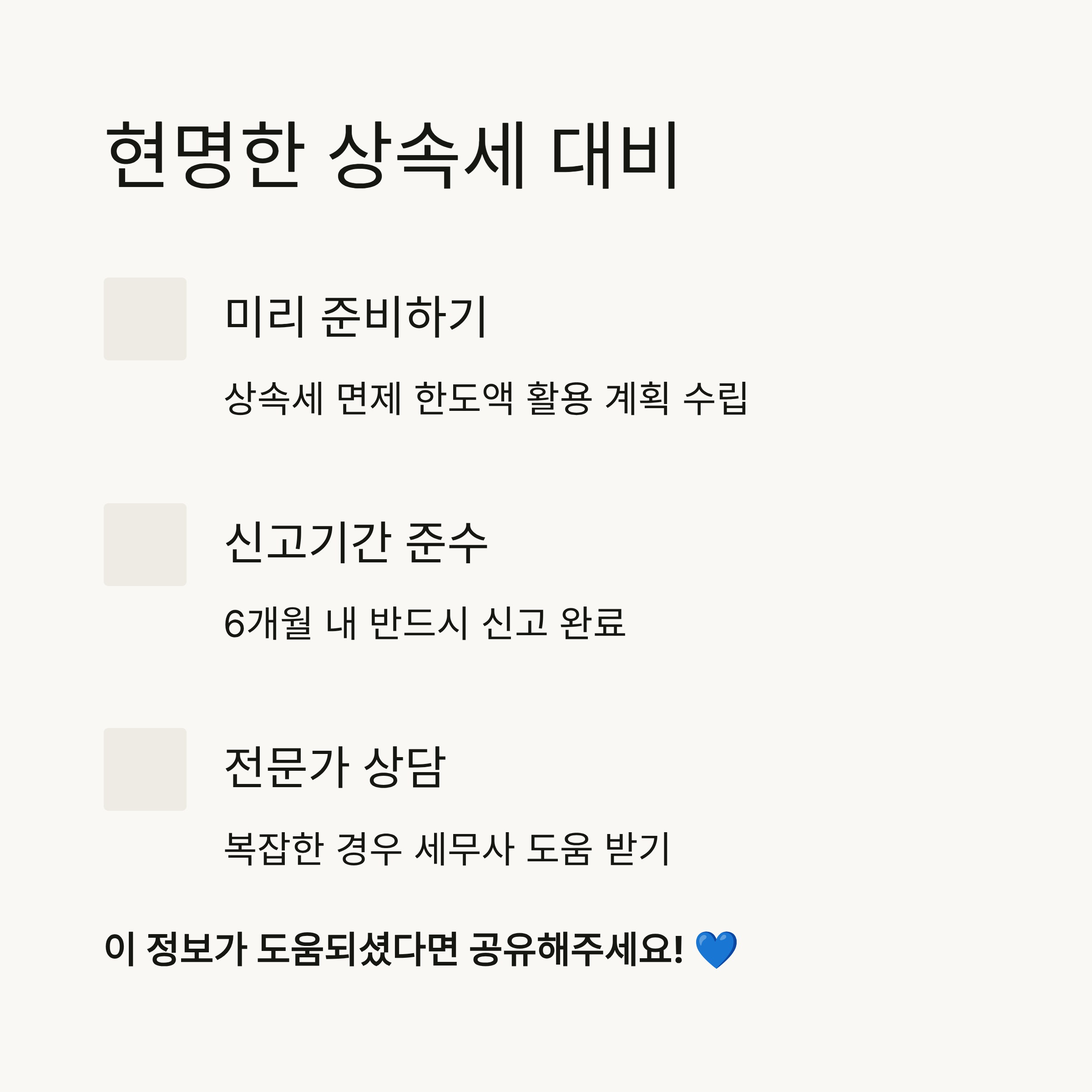 오늘 알아본 상속세 면제 한도액과 공제 항목, 그리고 상속세 신고기간을 잘 기억해두신다면 불필요한 세금을 막고 소중한 유산을 온전히 지키는 데 큰 도움이 될 것입니다. 경황이 없으시겠지만, 기한 내에 꼼꼼히 챙기셔서 원만하게 상속 절차를 마무리하시길 바랍니다. ✅