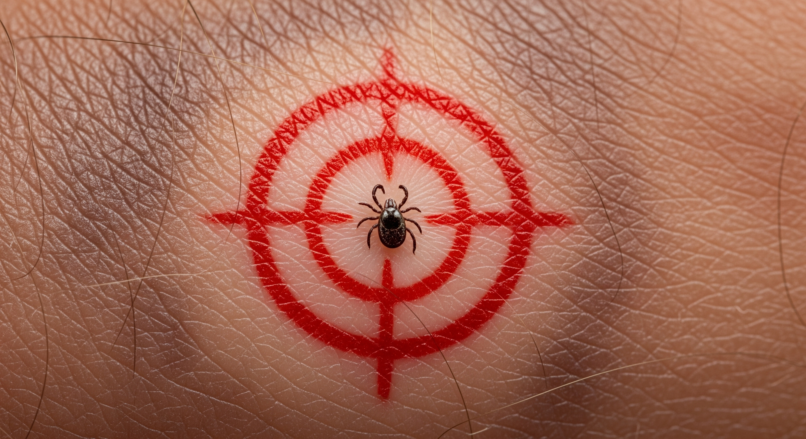 - 피부에 박힌 진드기가 보이기도 함 - 물린 부위 주변에 붉은 원형의 '과녁 모양' 발진 (라임병 의심) - 검은 딱지(가피)가 생기기도 함 (쯔쯔가무시증 의심) |