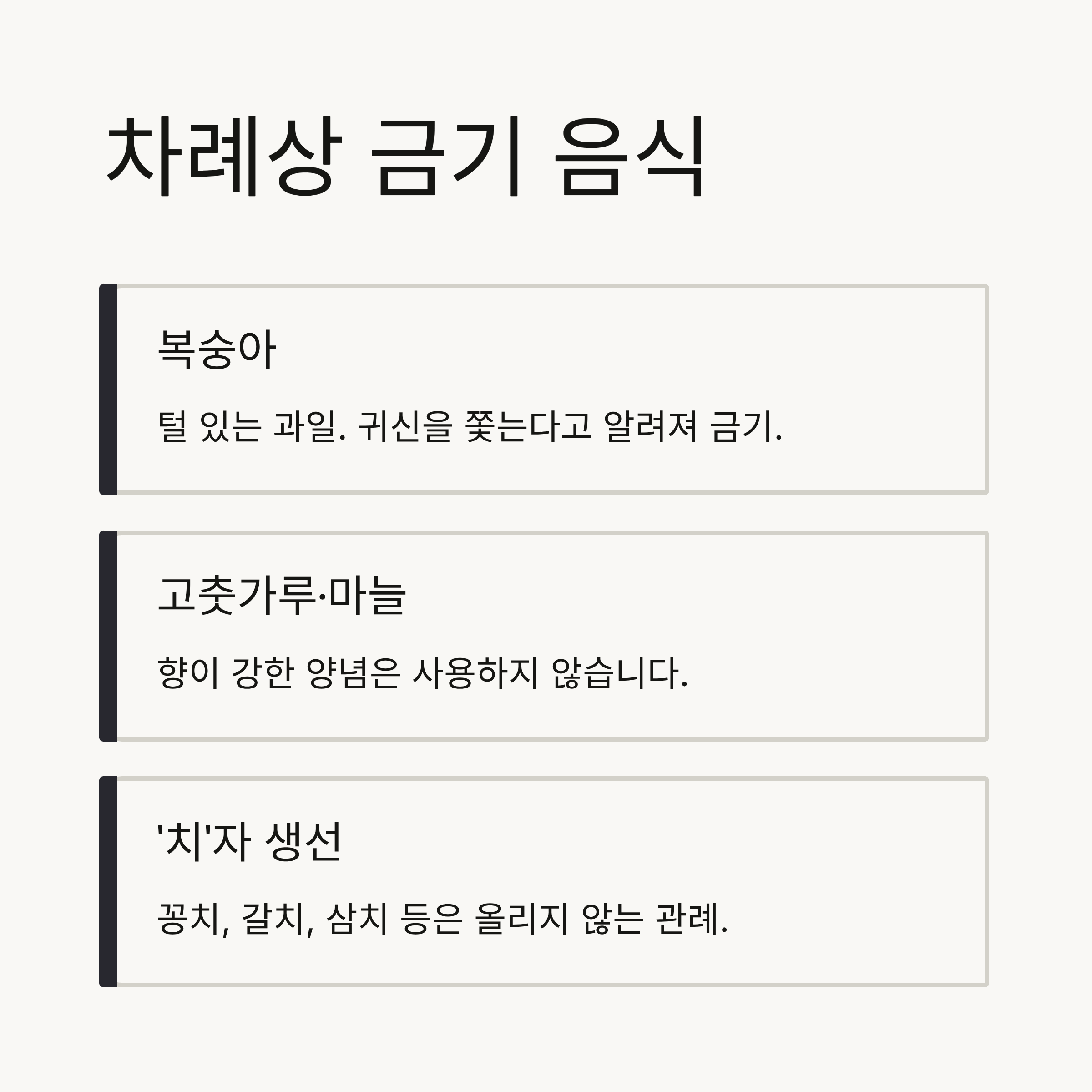 A. 네, 몇 가지 금기 음식이 있습니다. 복숭아처럼 털이 있는 과일은 귀신을 쫓는다고 알려져 있어 올리지 않습니다. 또한, 고춧가루나 마늘 같은 향이 강한 양념은 사용하지 않습니다. 생선 중에서는 '치' 자로 끝나는 꽁치, 갈치, 삼치 등은 올리지 않는 것이 일반적인 관례입니다.