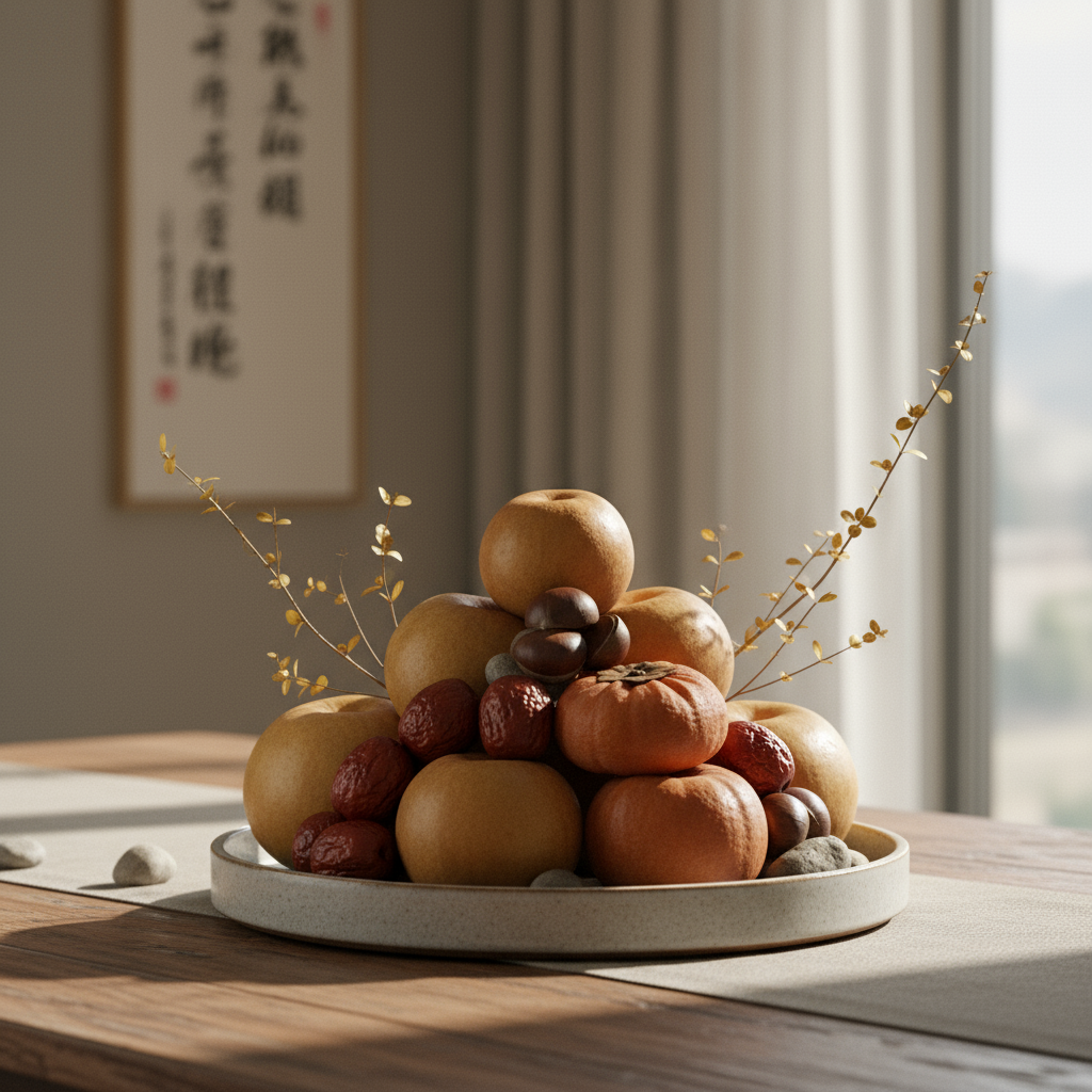 추석에 수확한 햇과일을 올리는 것은 수확의 기쁨을 조상과 나누는 중요한 의미를 가집니다. 대표적으로 대추(자손 번창), 밤(조상과의 연결), 배(지혜), 곶감(으뜸) 등을 올리며, 과일의 위아래를 조금씩 잘라내고 홀수로 담아내는 것이 일반적입니다.