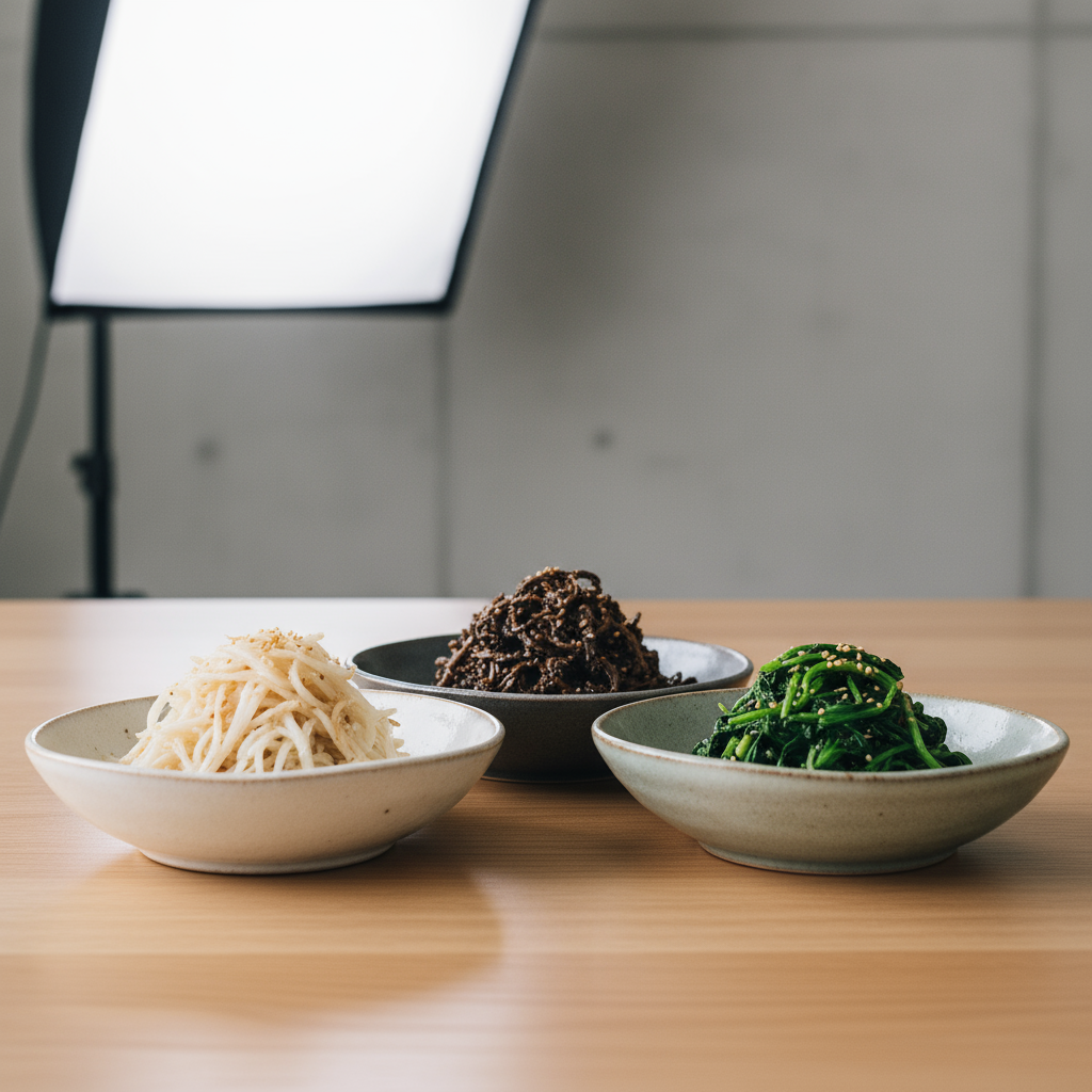 뿌리, 줄기, 잎을 상징하는 세 가지 나물을 올립니다. 보통 흰색의 도라지(조상), 검은색의 고사리(부모), 녹색의 시금치(자손)를 준비하여 가족의 화합과 건강을 기원하는 의미를 담습니다.