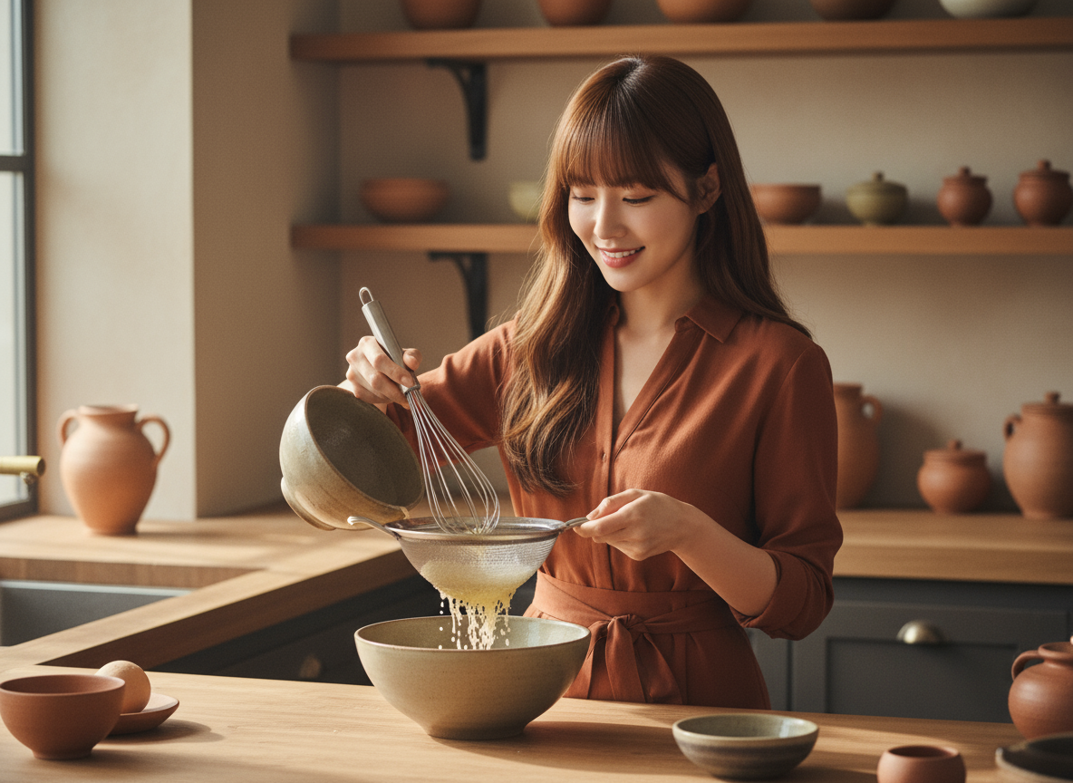이 과정이 바로 부드러운 전자레인지 계란찜 만들기의 가장 중요한 비법이에요! 완성된 계란물을 고운 체에 한번 걸러주세요. 조금 번거롭게 느껴질 수 있지만, 이 과정을 거쳐야 알끈이나 덜 풀린 덩어리들이 걸러져 푸딩처럼 매끈하고 부드러운 식감을 만들 수 있답니다. 정말 차원이 달라져요!
