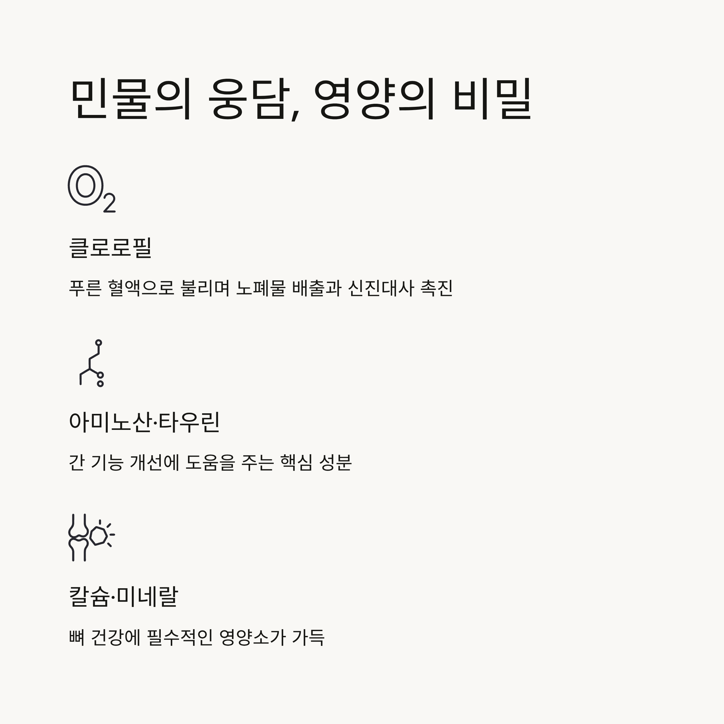 다슬기가 '민물의 웅담'이라는 별명을 가진 이유는 그 풍부한 영양 성분 때문입니다. 특히 푸른빛을 띠게 하는 클로로필(엽록소) 성분은 사람의 혈액 속 헤모글로빈과 구조가 비슷하여 '푸른 혈액'이라고도 불리는데요, 체내 노폐물 배출과 신진대사 촉진에 도움을 줄 수 있다고 알려져 있습니다.