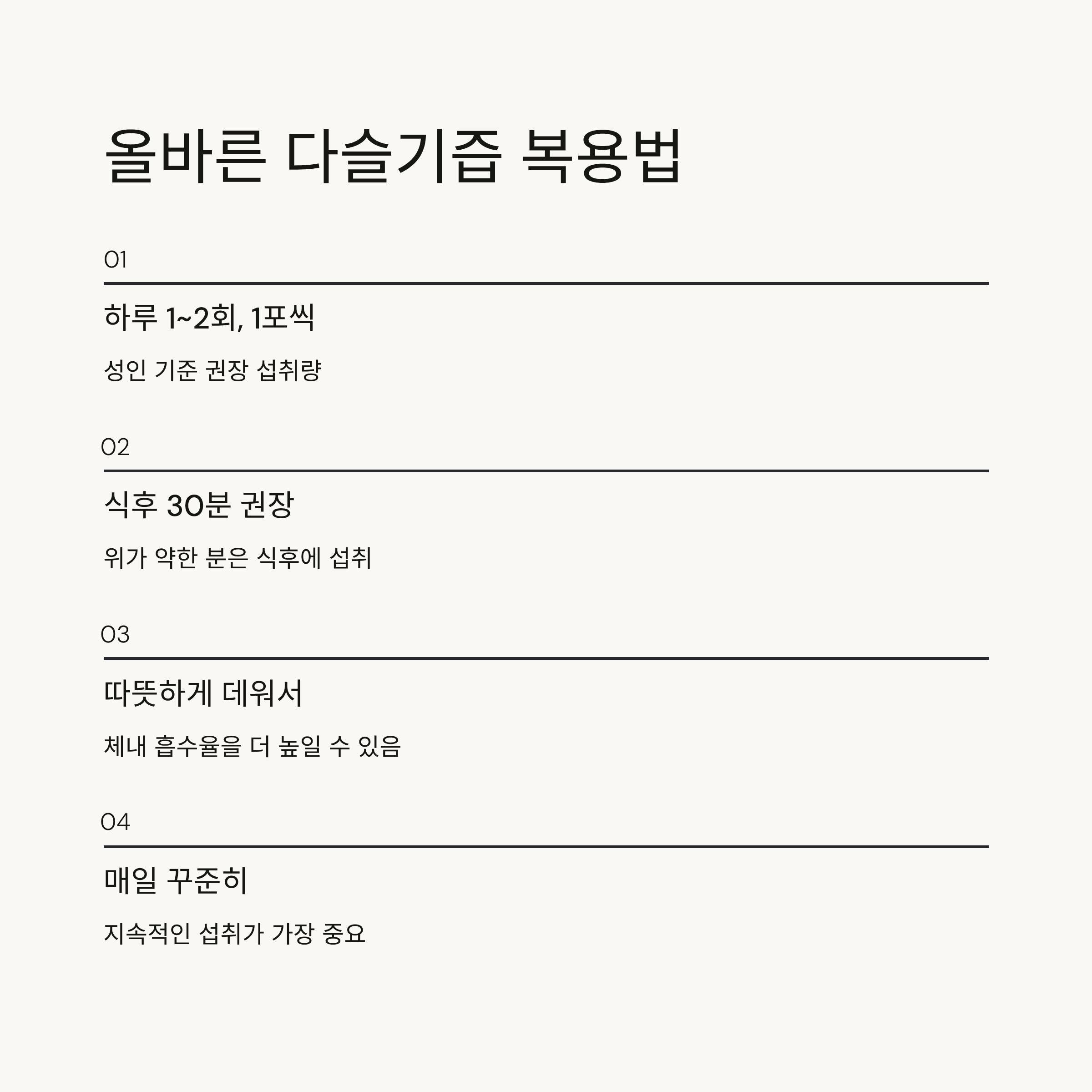 아무리 좋은 식품이라도 제대로 먹어야 그 효과를 온전히 누릴 수 있겠죠? 올바른 다슬기즙 복용법은 생각보다 간단합니다. 일반적으로 성인 기준 하루 1~2회, 1포씩 섭취하는 것을 권장합니다.