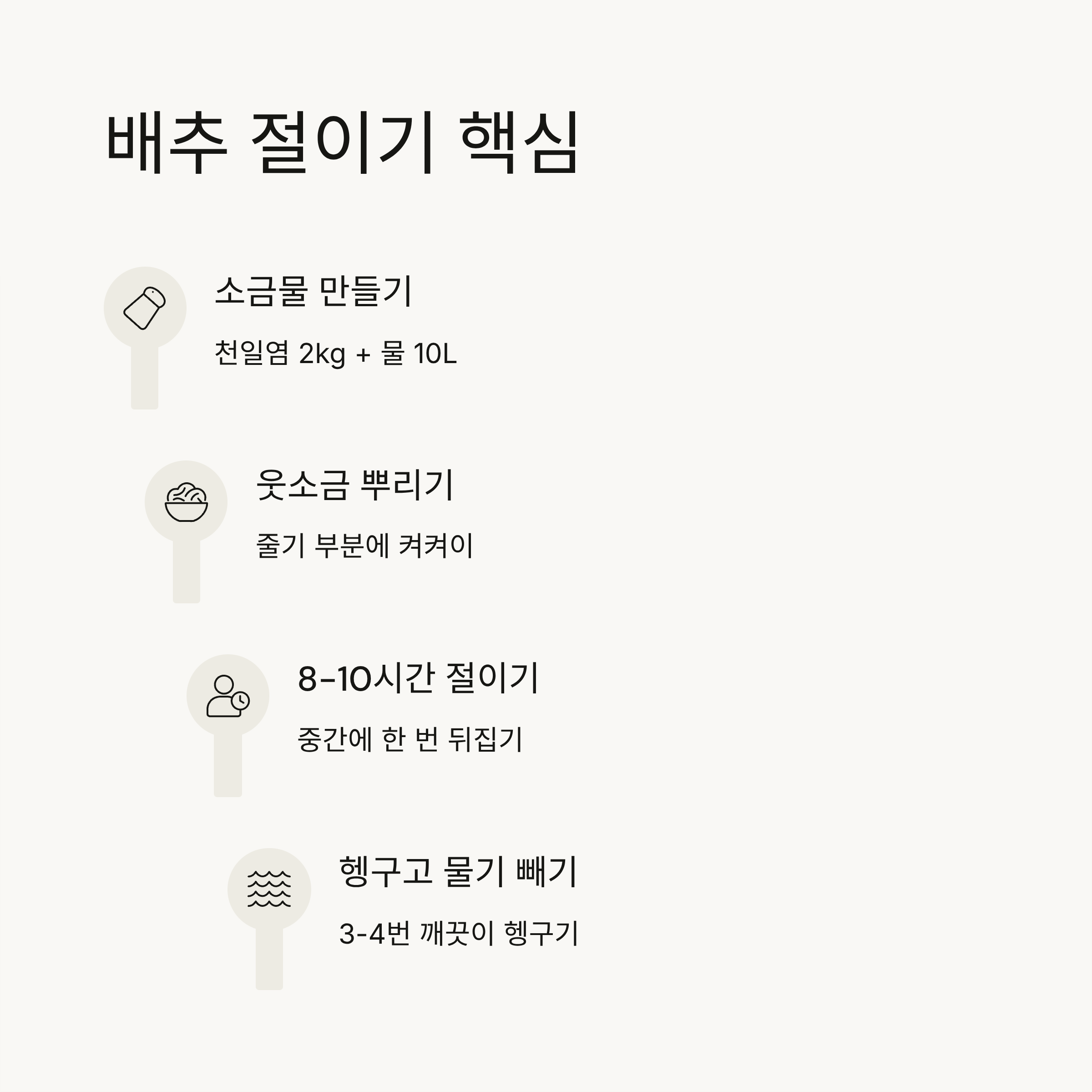 잘 절여진 배추는 줄기 부분을 구부렸을 때 부러지지 않고 부드럽게 휘어지는 상태가 되어야 합니다. 절인 후에는 3~4번 깨끗하게 헹궈 채반에 밭쳐 물기를 완전히 빼주세요. 이 과정이 김치의 아삭함을 좌우합니다.