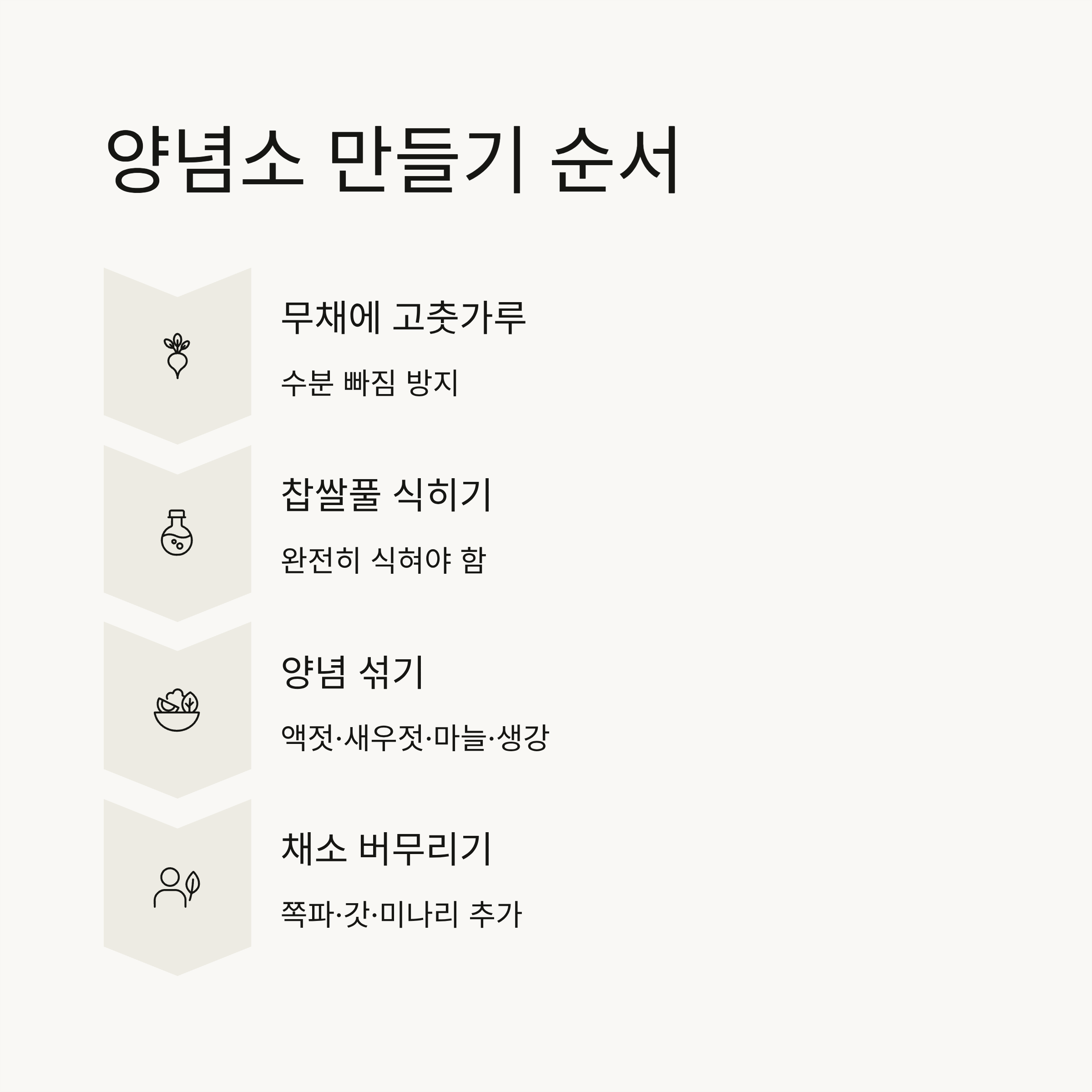 이렇게 하면 무에서 수분이 빠져나오는 것을 막아 김치가 물러지는 것을 방지할 수 있어요. 찹쌀풀은 미리 쑤어서 완전히 식혀두어야 합니다. 뜨거운 찹쌀풀은 김치를 빨리 시게 만드는 원인이 되거든요.