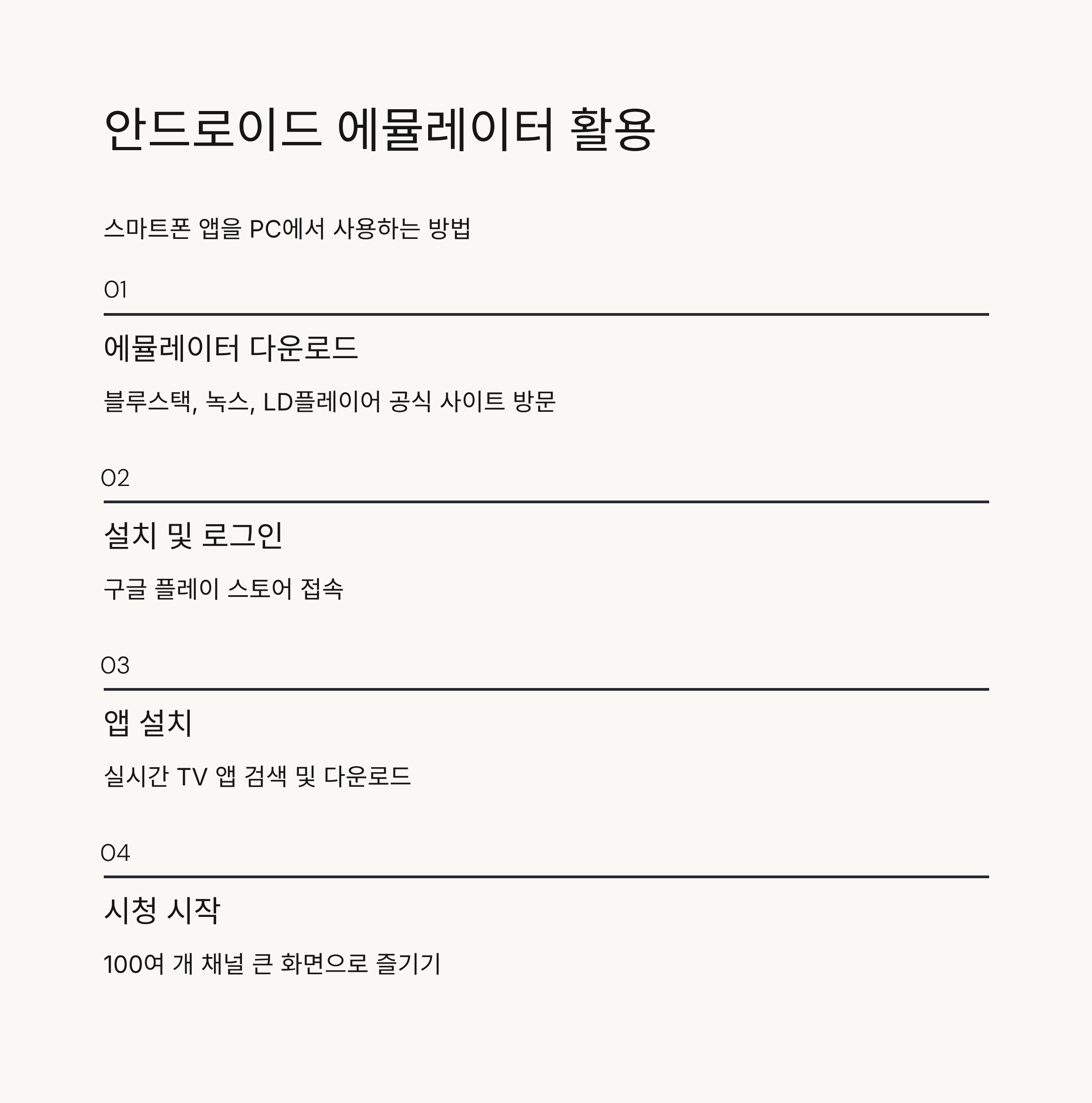 이 방법은 회원가입이 필요 없고 발열 걱정도 없어서 장시간 시청하기에 좋습니다. 다만 에뮬레이터를 실행하려면 최소 2GB 이상의 RAM과 5GB의 여유 디스크 공간이 필요하다는 점을 확인하시기 바랍니다.
