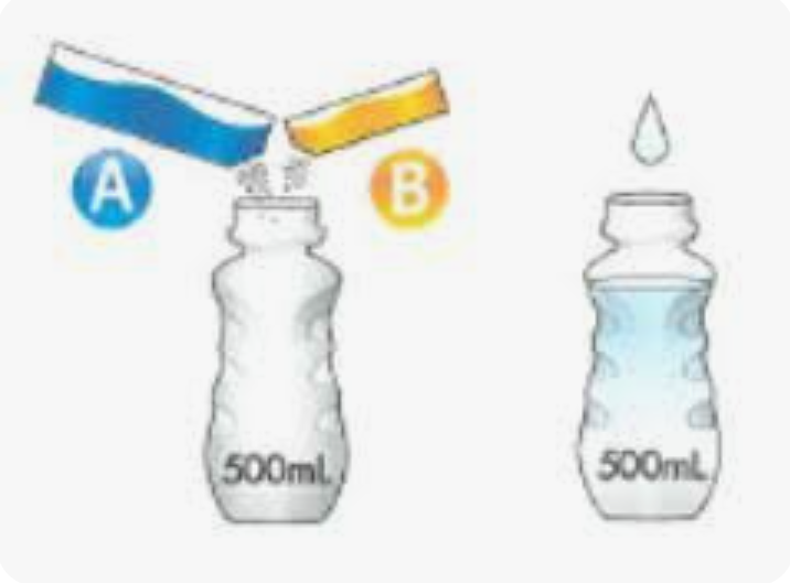 A제 1포와 B제 1포를 500mL 통에 넣고 생수 500mL를 표시선까지 채운 뒤 뚜껑을 닫고 완전히 녹을 때까지 흔들어주세요. 차가운 물로 타면 맛이 덜 역하고 장 정결 효과도 더 좋습니다. 절대 보리차나 뜨거운 물로 타지 마시고 생수만 사용하세요.