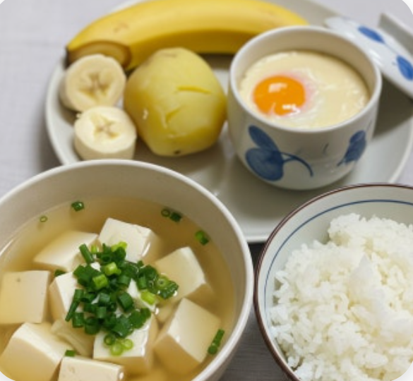 * 흰쌀밥, 흰죽 (깨, 김가루, 참기름 등 고명 없이) * 흰 식빵 (통밀빵, 잡곡빵 절대 금지), 카스테라 * 찹쌀, 감자 (껍질 제거), 밀가루 (수제비, 칼국수 등)