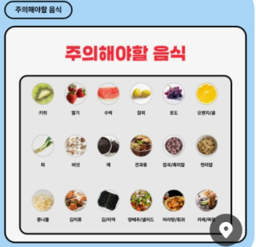 | 과일류 (씨앗) | 딸기, 참외, 키위, 포도, 수박, 오렌지 (껍질) | 작은 씨앗이 장을 막을 수 있음 |