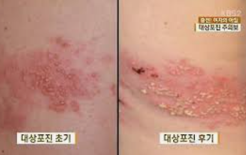통증이 시작된 후 3~7일 이내에 피부에 붉은 반점이 나타나기 시작합니다. 이 반점들은 신경 경로를 따라 띠 모양으로 배열되며, 주로 몸통, 얼굴, 엉덩이 주변에 많이 발생합니다. 붉은 반점이 보이는 순간 즉시 병원을 방문해야 합니다.