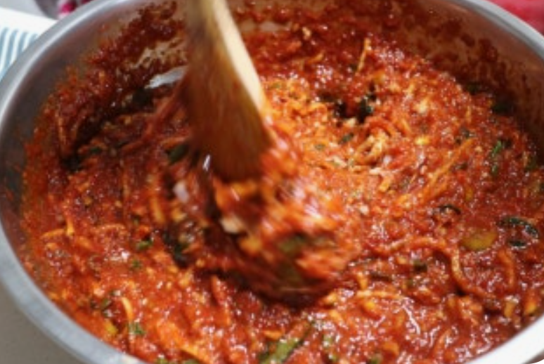 이제 모든 재료를 합칠 시간입니다. 큰 대야에 고춧가루 물들인 무채를 넣고, 식힌 찹쌀풀, 다진 마늘, 다진 생강, 젓갈류, 갈아놓은 배/양파, 매실청을 모두 넣어 골고루 섞어줍니다. 이 상태로 30분 정도 두어 고춧가루 색이 우러나오게 합니다.