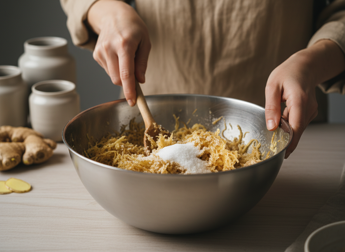손질한 생강을 적당한 크기로 썰어 믹서기나 푸드 프로세서에 넣고 갈아줍니다. 씹히는 식감이 좋다면 굵게 다지고, 부드러운 청을 원한다면 곱게 갈아주세요. 착즙기를 사용해 즙만 내려도 깔끔하지만, 건더기에도 영양분이 많으니 함께 사용하는 것을 추천합니다.