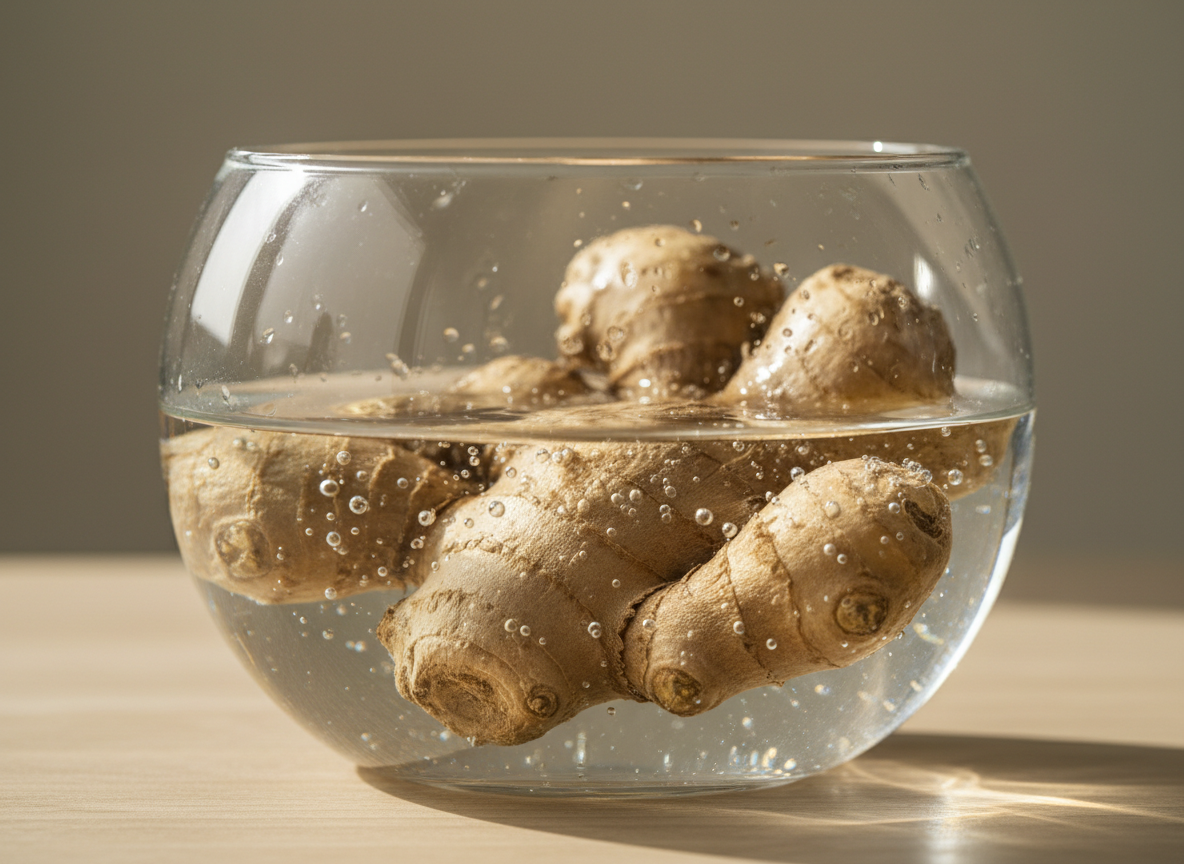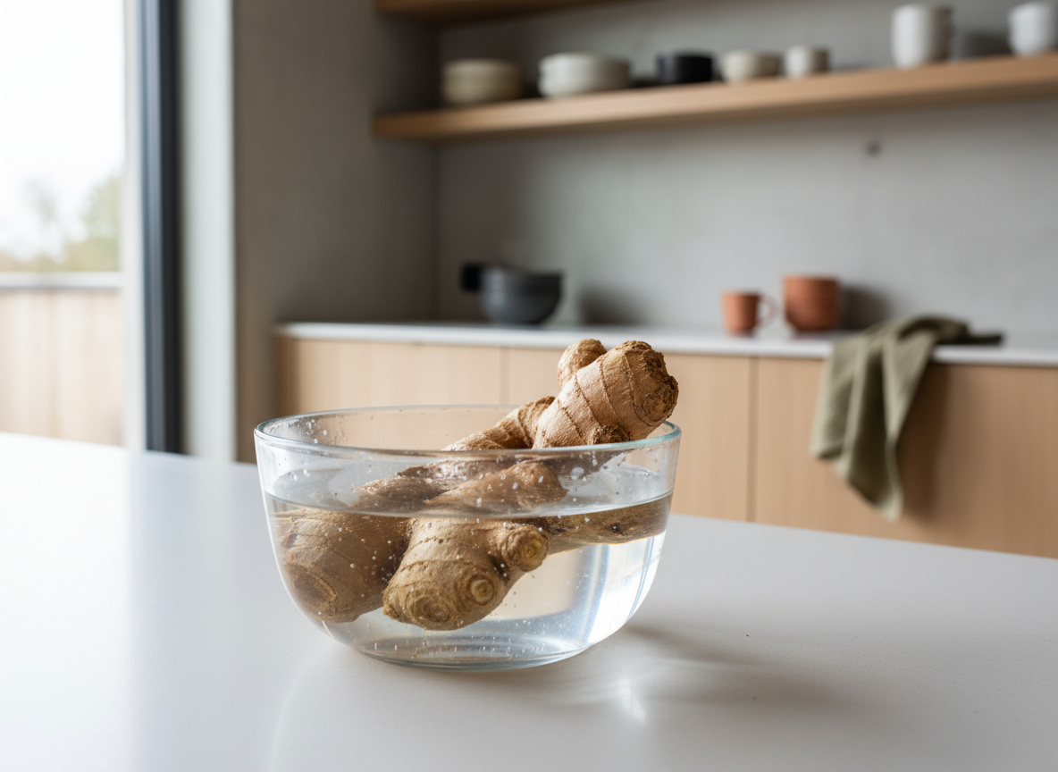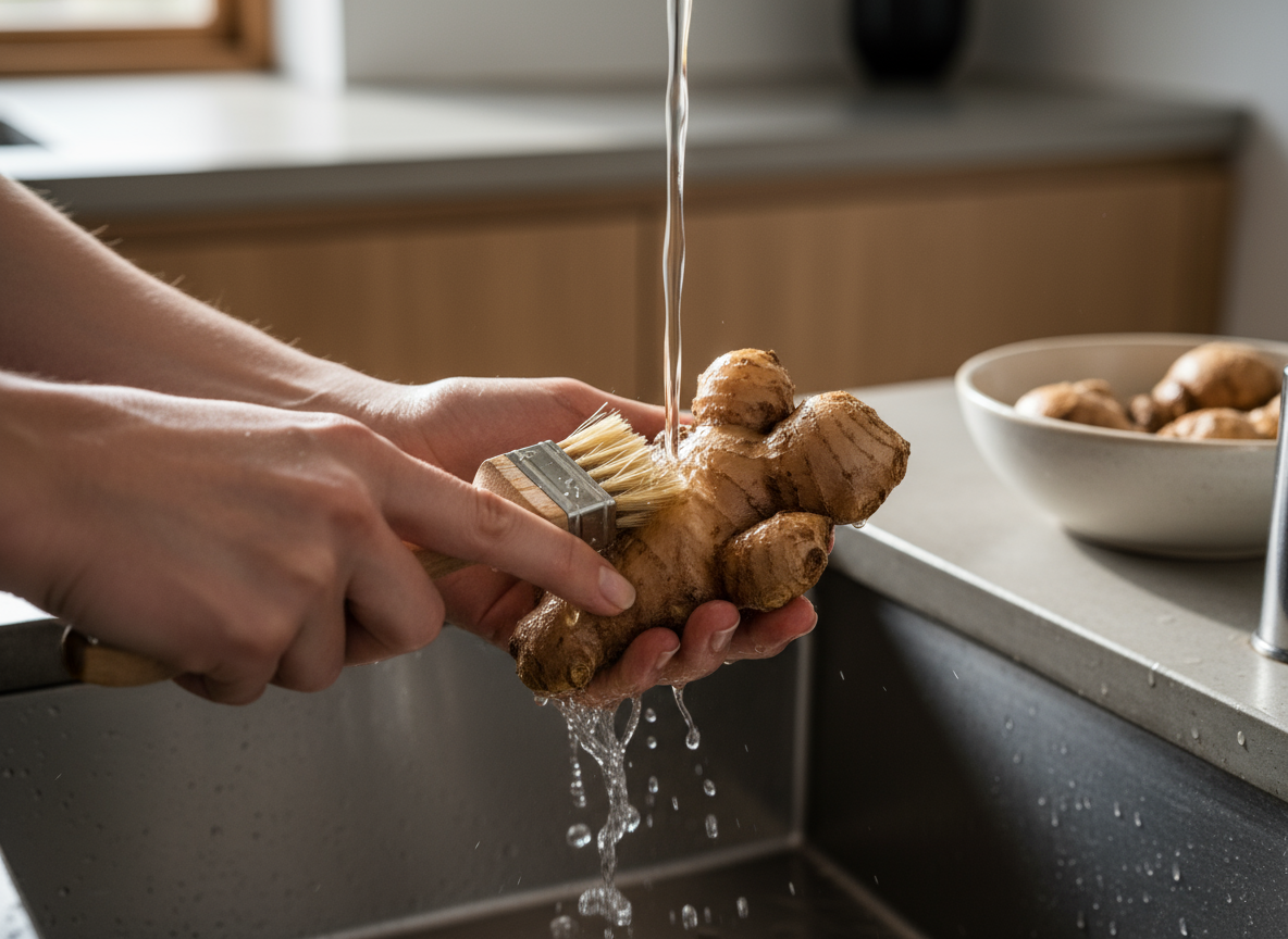 먼저 생강을 물에 10분 정도 담가 흙을 불려줍니다. 그다음 칫솔이나 부드러운 솔로 구석구석 문질러 흙과 이물질을 제거해 주세요.