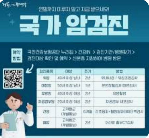 | 주요 암 검진 | 위암(40세+), 간암(40세+ 고위험군), 대장암(50세+), 유방암(여성 40세+), 자궁경부암(여성 20세+), 폐암(54~74세 고위험군) |