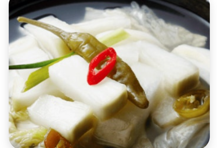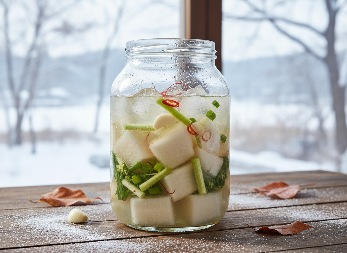 전통적인 동치미 맛있게 담는법은 찹쌀풀(물 1컵 + 찹쌀가루 1스푼)을 묽게 쑤어 식혀서 넣습니다. 찹쌀풀은 유산균의 먹이가 되어 발효를 돕고, 국물 맛을 더 깊고 톡 쏘게 만듭니다.