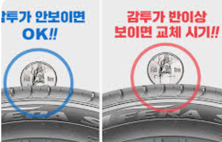 자를 가지고 다닐 수 없으니 간편한 방법이 있습니다. 100원짜리 동전을 타이어 홈에 끼워보세요. 이순신 장군님의 감투가 보이지 않으면 아직 수명이 남은 것이고, 감투 끝부분이 보이면 타이어 비용을 준비하고 교체를 계획해야 할 시기입니다.