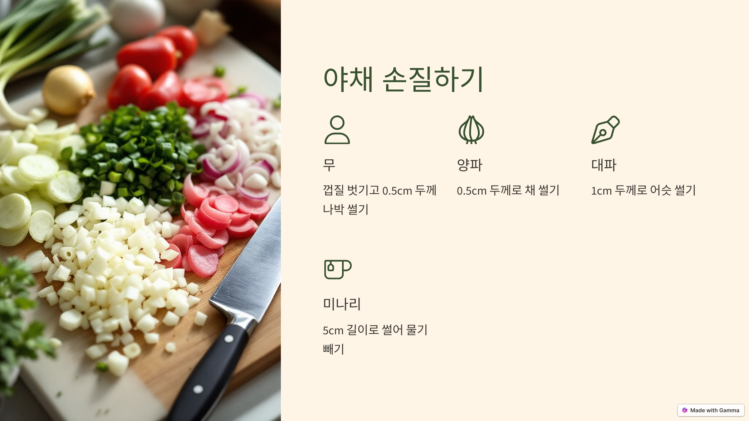 대파: 흰 부분과 초록 부분을 모두 사용해 1cm 두께로 어슷 썰기합니다.