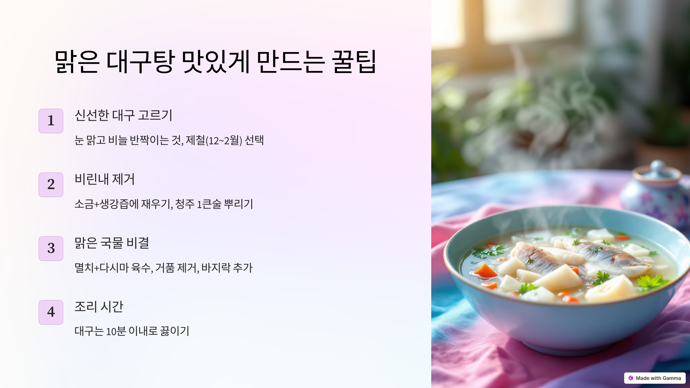 1. 신선한 대구 고르기: 눈이 맑고 비늘이 반짝이며, 살을 눌렀을 때 탄력이 있는 걸 골라요. 제철(12~2월)이면 더 맛있어요!