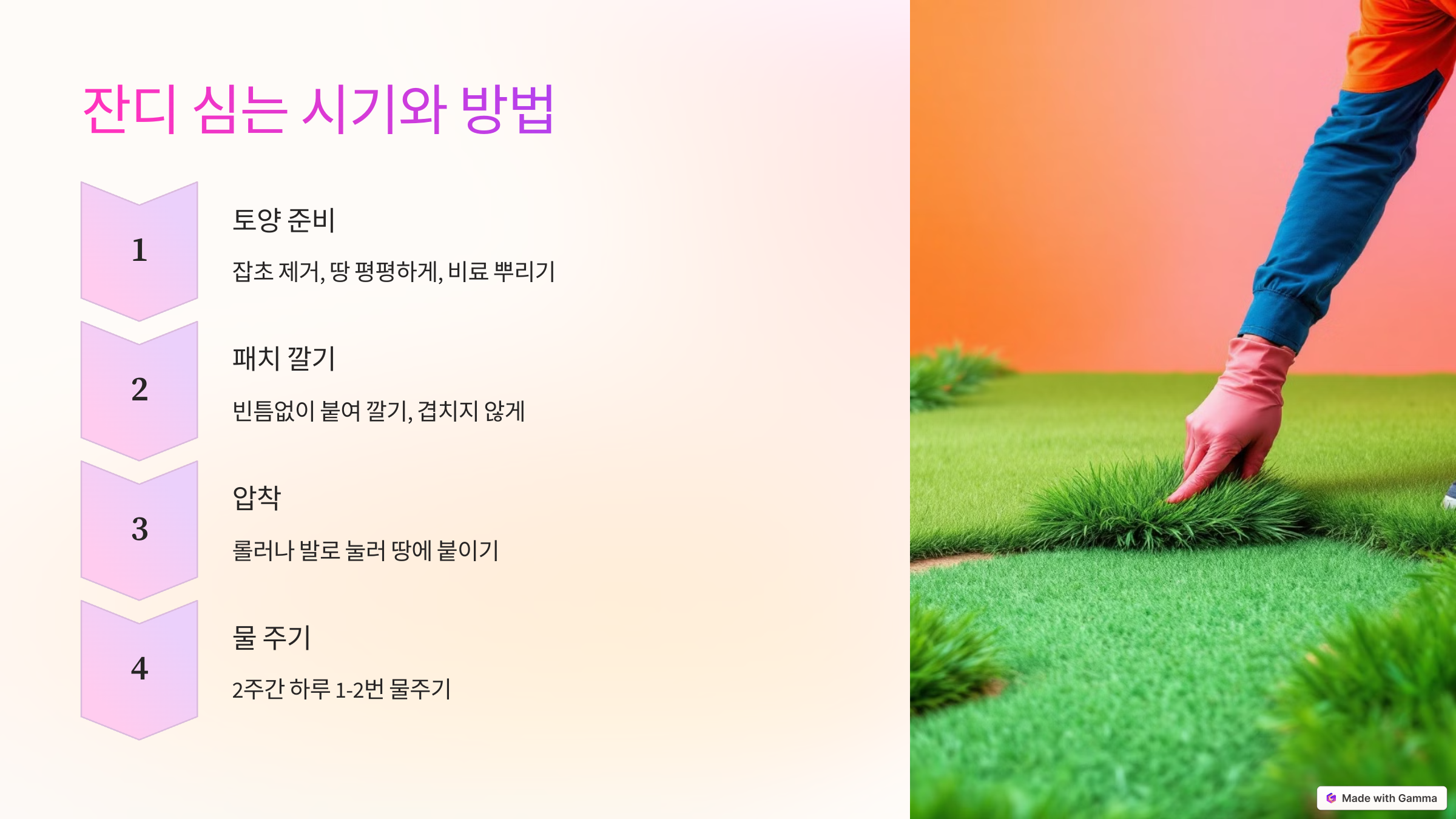 잔디 패치: 연중 가능하지만, 봄(3~5월)이나 가을(9~10월)이 뿌리가 잘 내리기에 적합합니다.