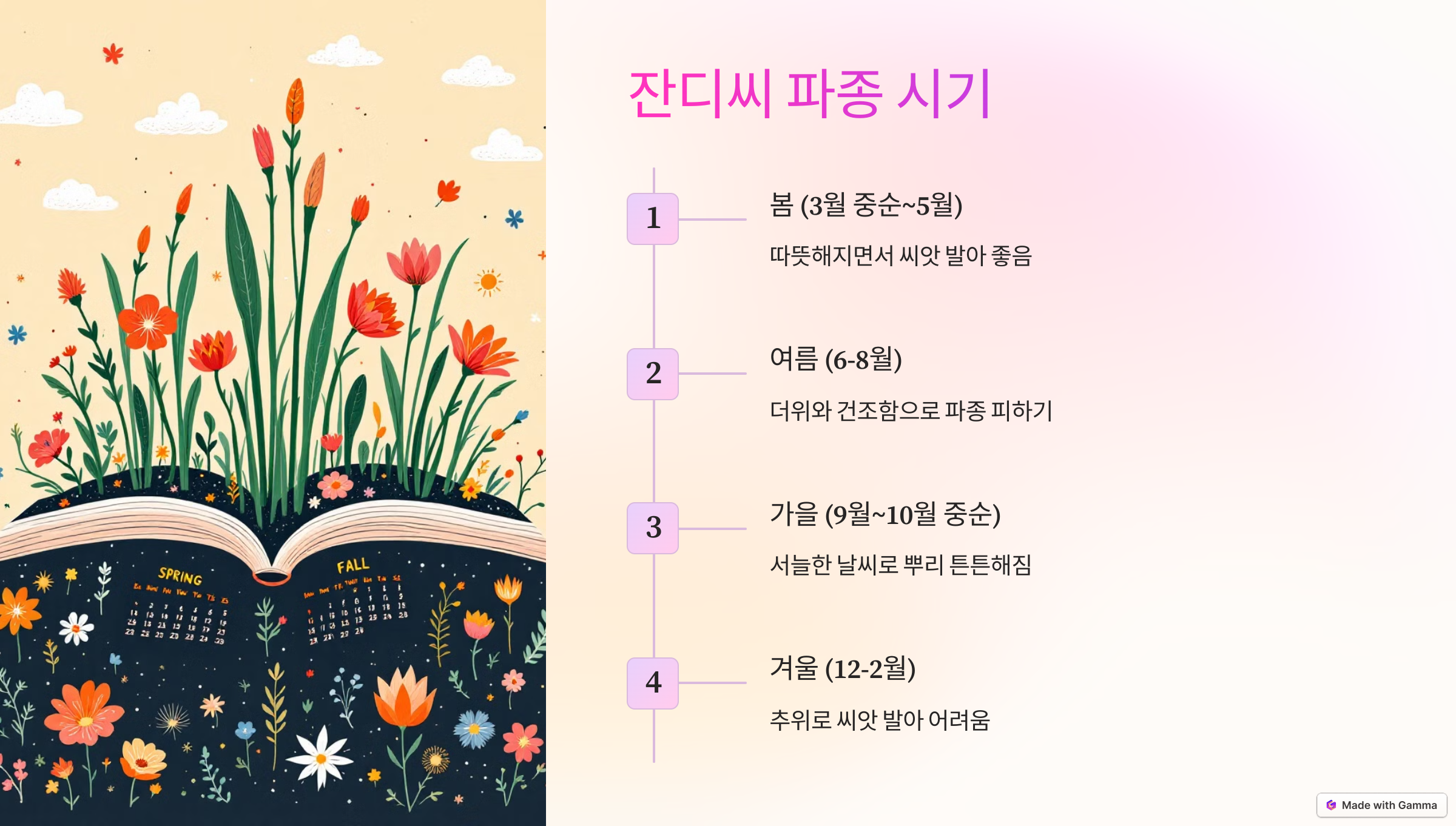 지역 고려: 한국은 지역마다 날씨가 달라서(남부는 따뜻, 북부는 추움) 품종과 시기를 잘 맞추세요.