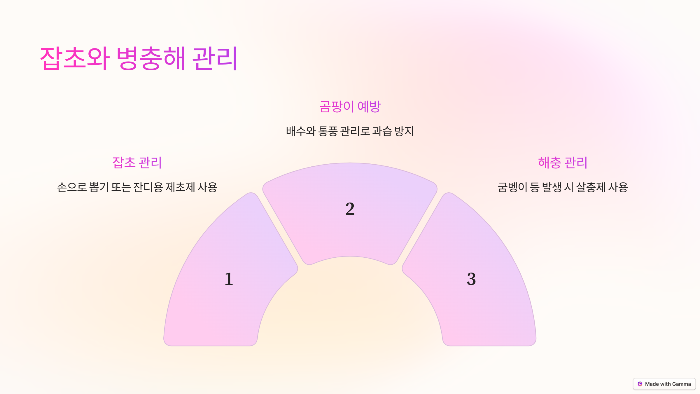 해충: 굼벵이 같은 벌레가 생기면 살충제로 해결해 주세요.
