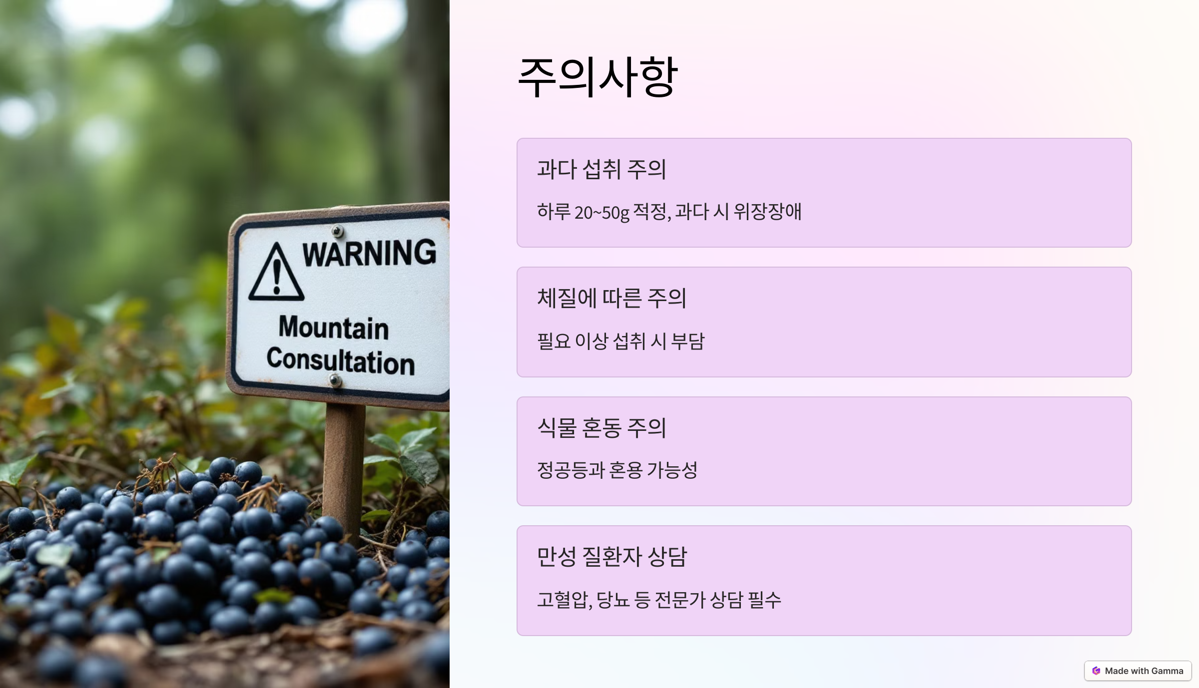 - 특정 질환(고혈압, 당뇨 등)을 앓고 있는 경우 전문가와 상담 후 섭취하는 것이 안전합니다.