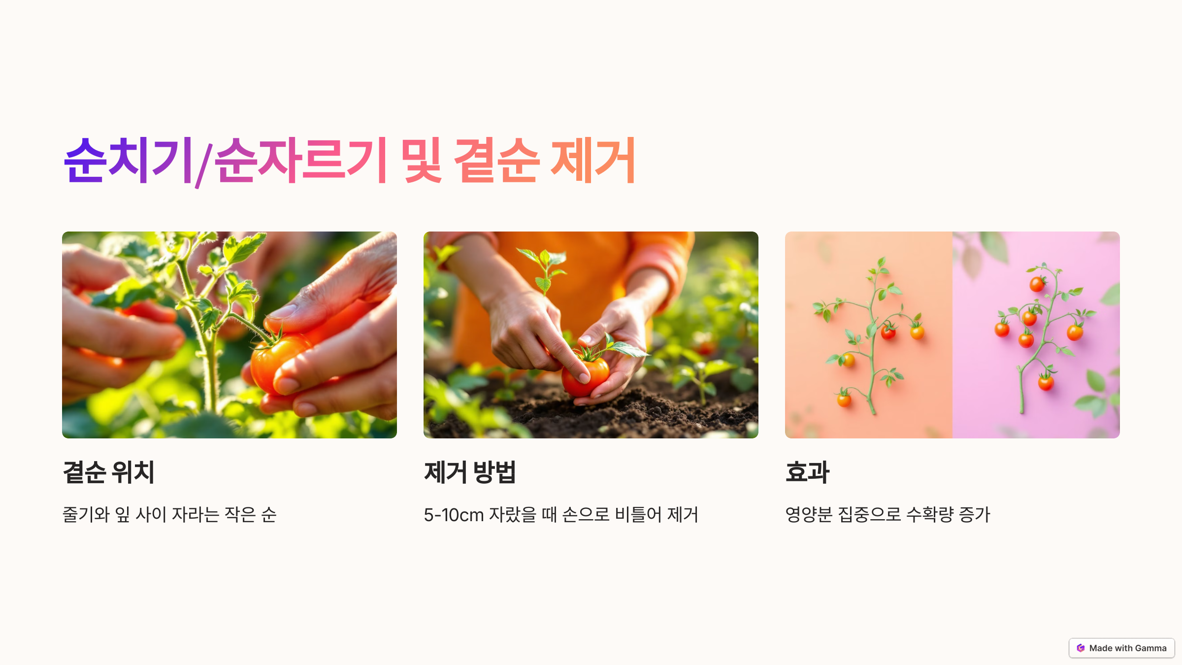 효과: 영양분이 주 줄기와 열매로 집중돼 수확량이 늘어요.