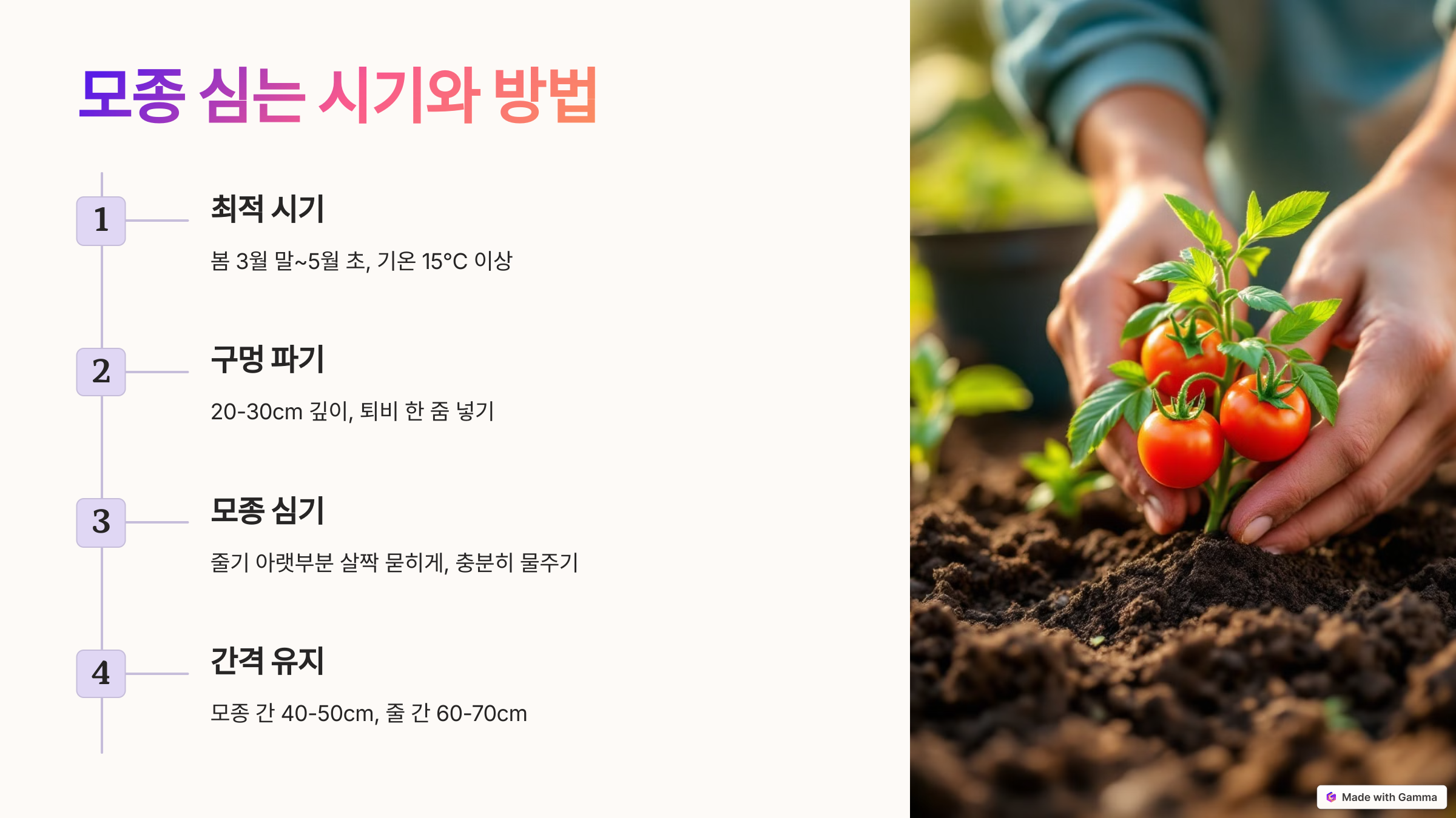 간격: 모종 간 40~50cm, 줄 간 60~70cm로 넉넉히 배치하세요.