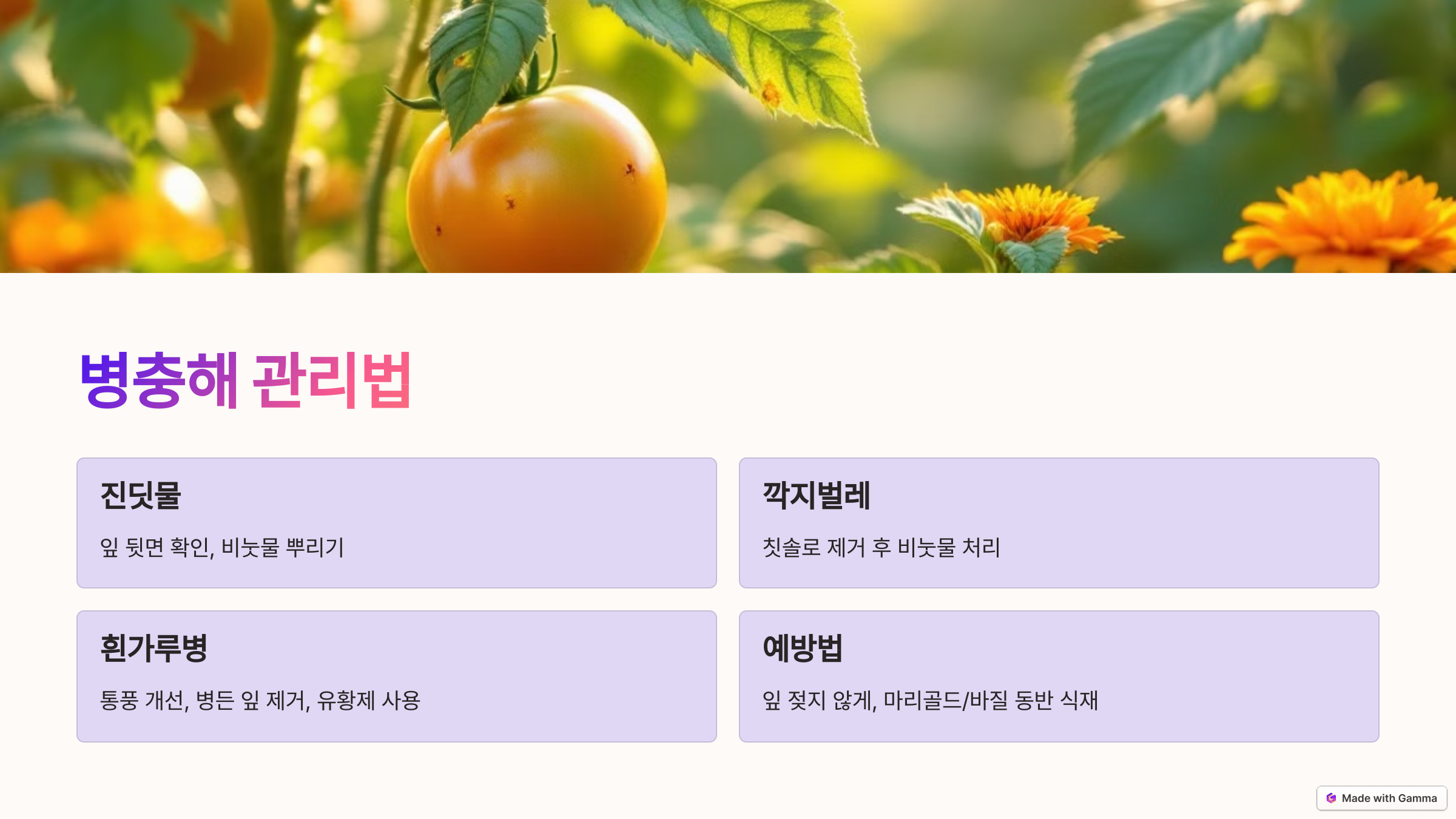 예방: 잎이 젖지 않게 물을 주고, 마리골드나 바질을 동반 식재하면 해충 방지에 좋아요.