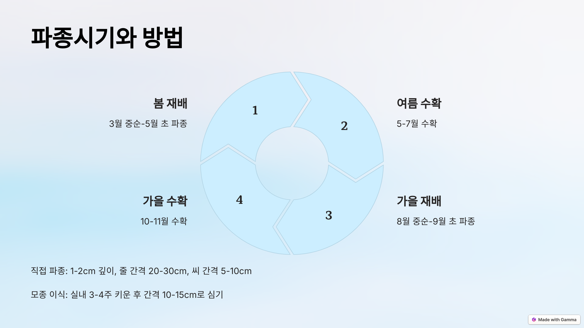 직접 파종: 씨앗을 1~2cm 깊이로 심고, 줄 간격은 20~30cm, 씨 간격은 5~10cm로 뿌립니다. 한 구멍에 2~3알씩 심어 발아율을 높일 수 있어요.