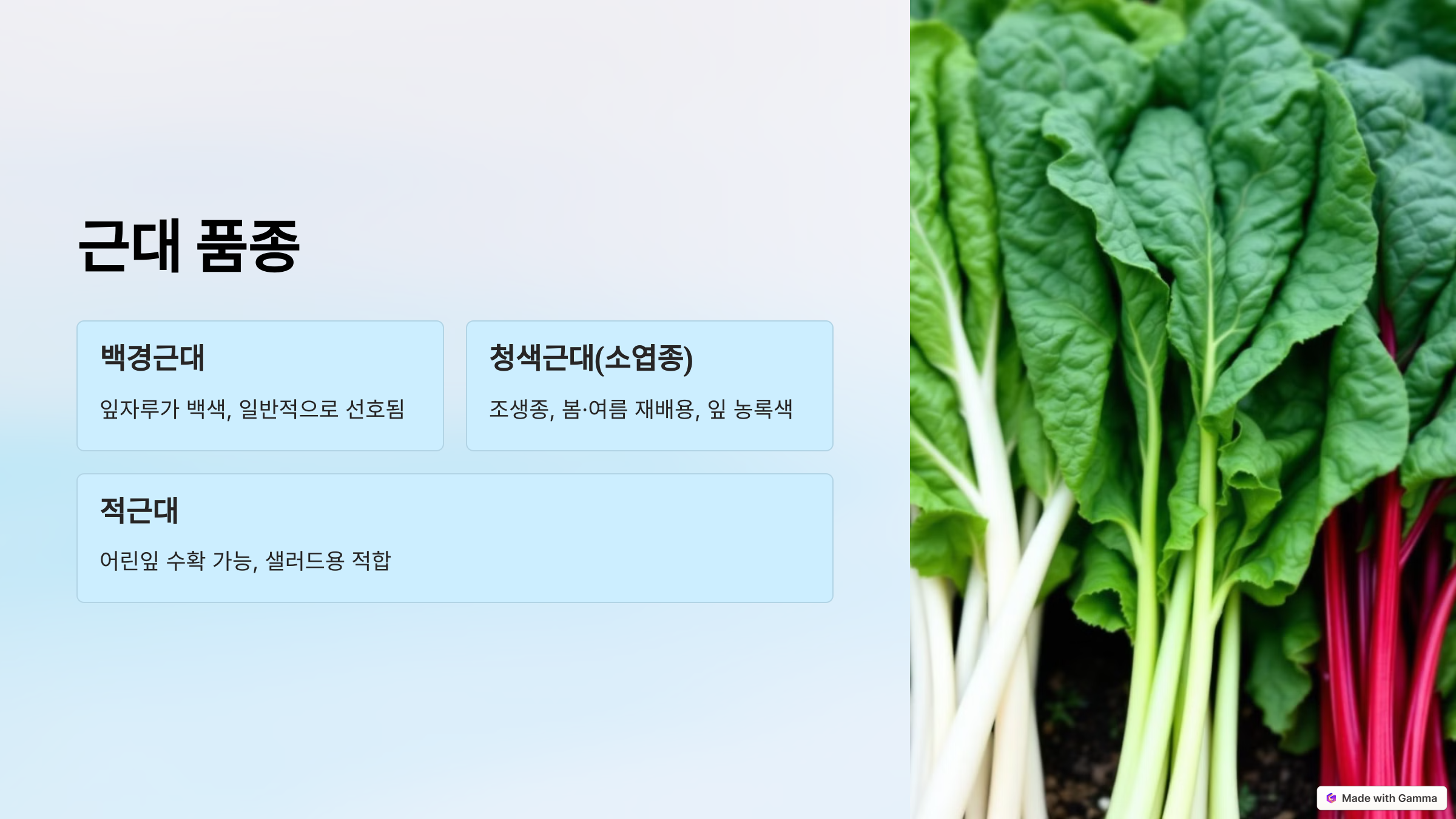 근대는 잎과 뿌리를 모두 먹을 수 있는 다재다능한 채소입니다. 시원한 기후를 좋아하며, 샐러드, 볶음, 국물 요리 등 다양한 방식으로 즐길 수 있어 가정 텃밭이나 소규모 농사에 딱 맞는 작물이에요.