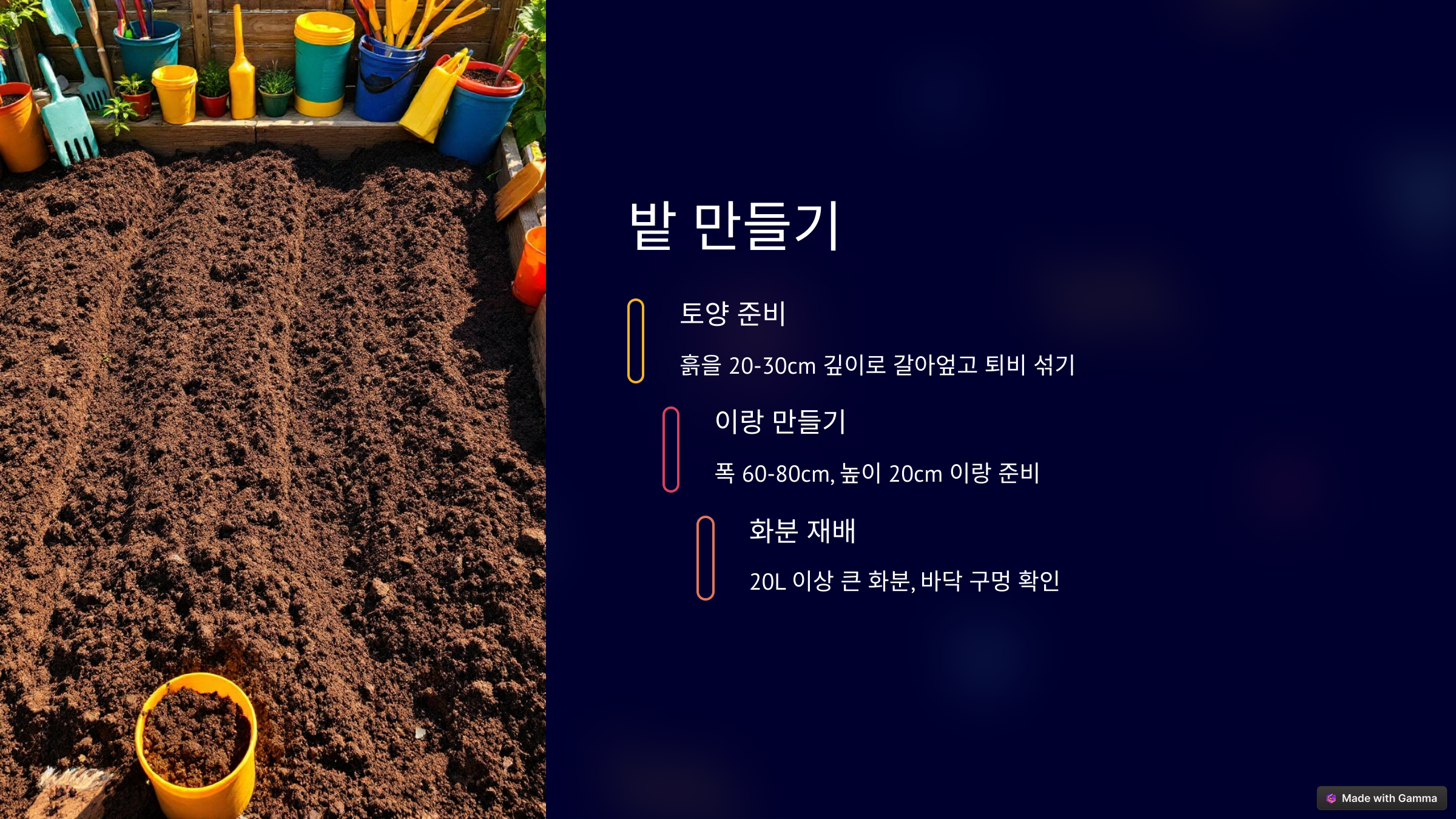 이랑 만들기: 폭 60~80cm, 높이 20cm 정도의 이랑을 만들어 심을 자리를 준비합니다. 이랑 사이 간격은 1m 정도 여유를 두세요.