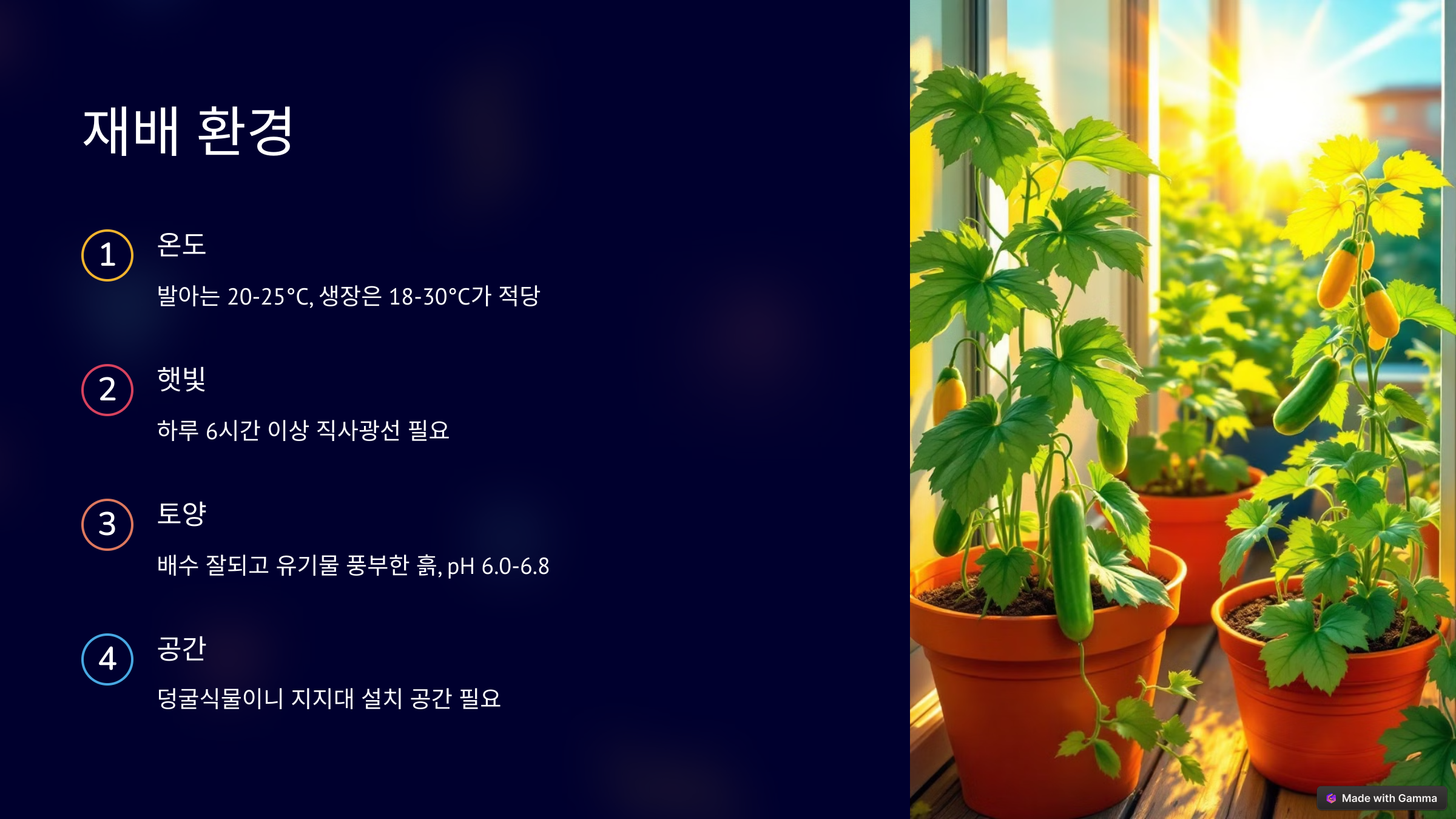 오이는 따뜻하고 햇빛이 잘 드는 환경에서 잘 자랍니다. 아래는 이상적인 조건이에요.
