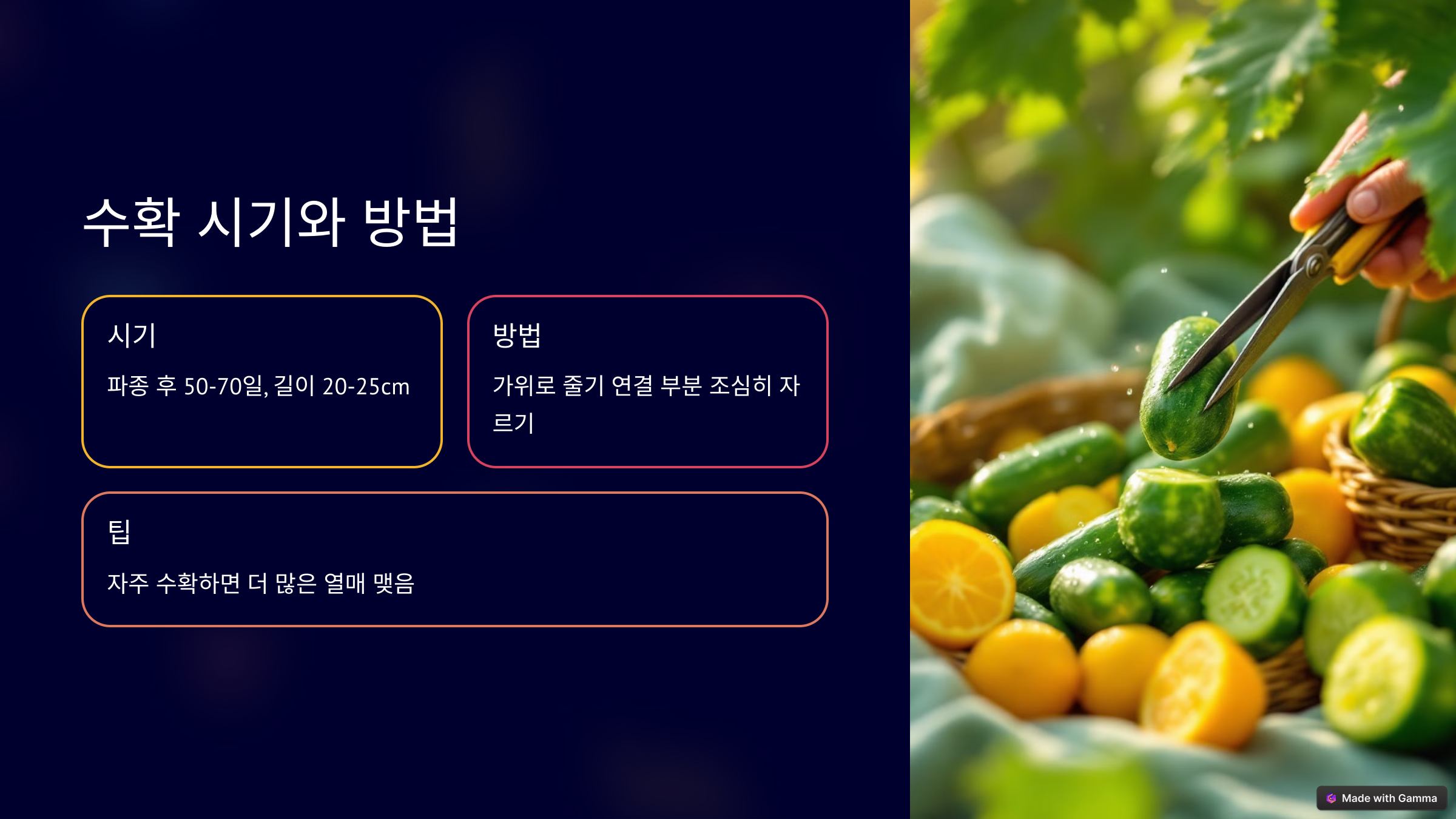 시기: 파종 후 50~70일, 오이 길이가 20~25cm 정도 됐을 때가 적당합니다. 품종에 따라 다를 수 있으니 씨앗 포장지를 확인하세요.