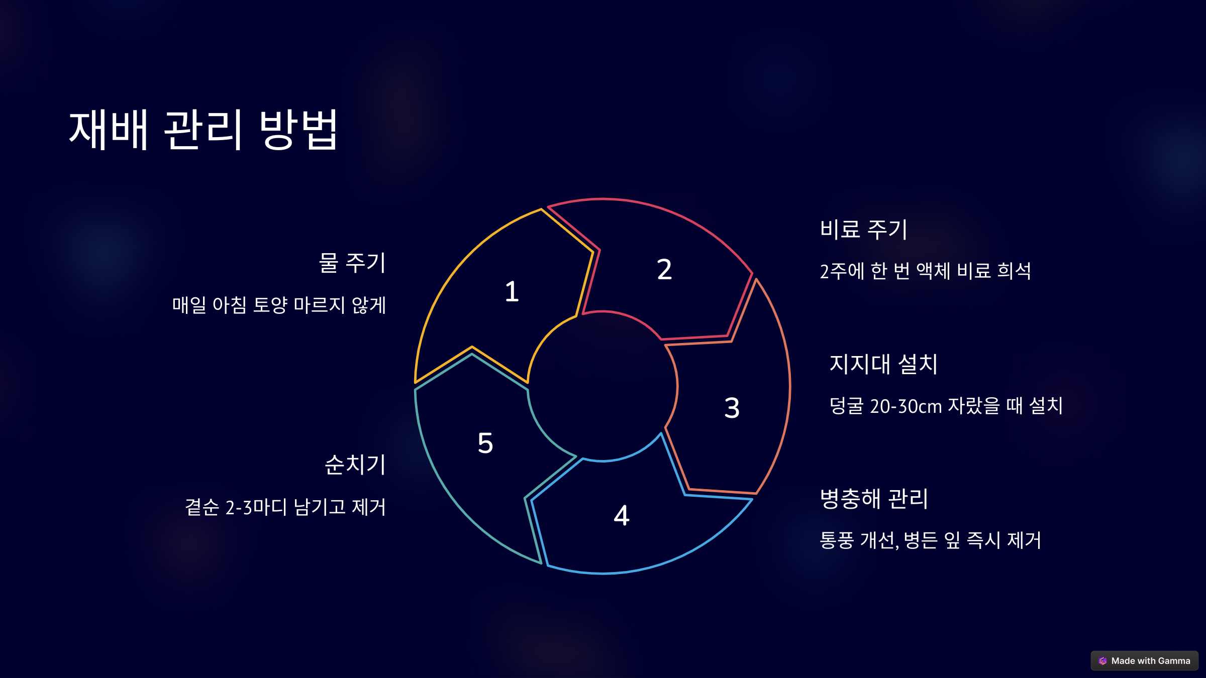 5. 초기 관리: 심은 후 흙이 마르지 않게 물을 주고, 밤에 온도가 떨어지면 비닐로 덮어 보온합니다.