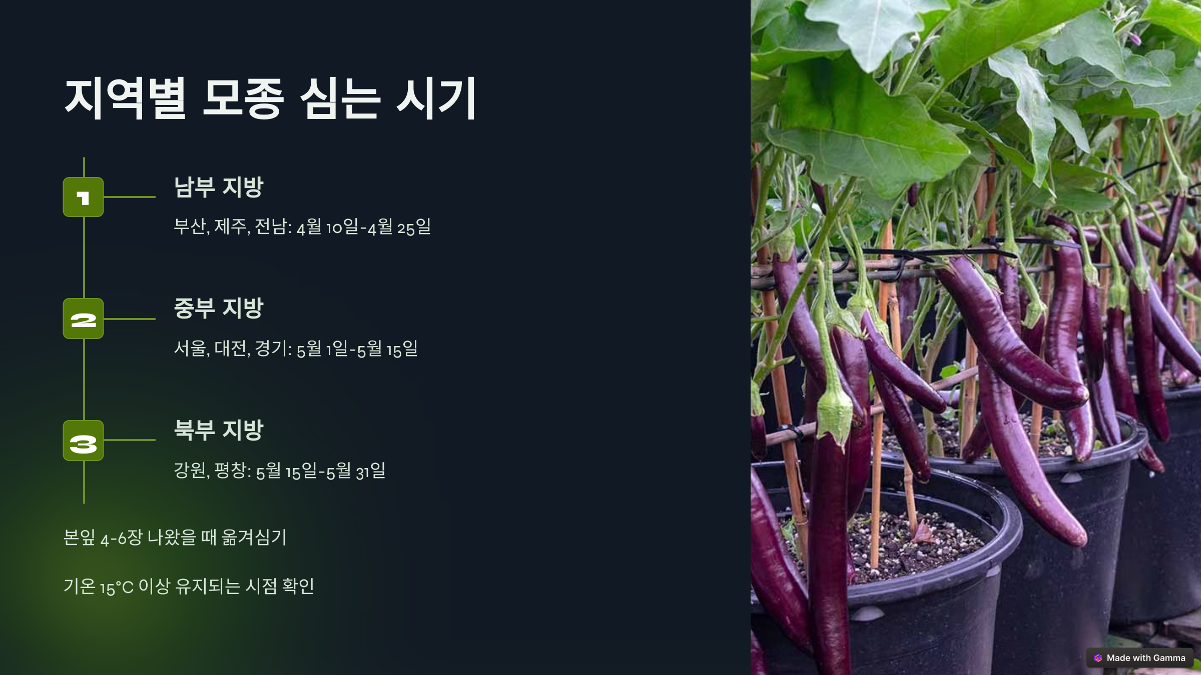 가지는 서리와 추위를 싫어하니 기온이 안정될 때 심는 게 중요해요. 지역별 적정 가지모종 심는시기는 다음과 같습니다.