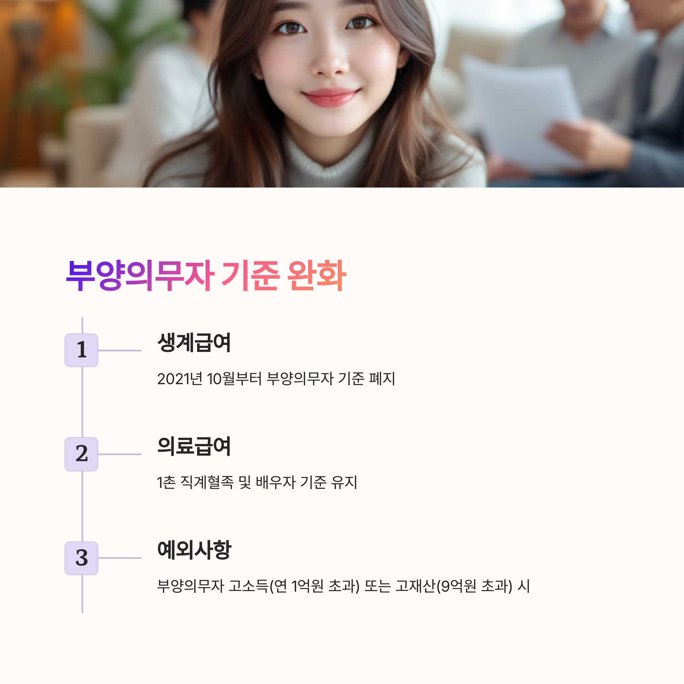 기초생활수급자 부양의무자는 수급자를 부양할 책임이 있는 1촌 직계혈족(부모, 자녀)과 그 배우자(사위, 며느리)를 말해요. 2021년부터 의료/주거/교육급여는 부양의무자 기준이 폐지됐지만, 생계급여는 여전히 적용돼요.