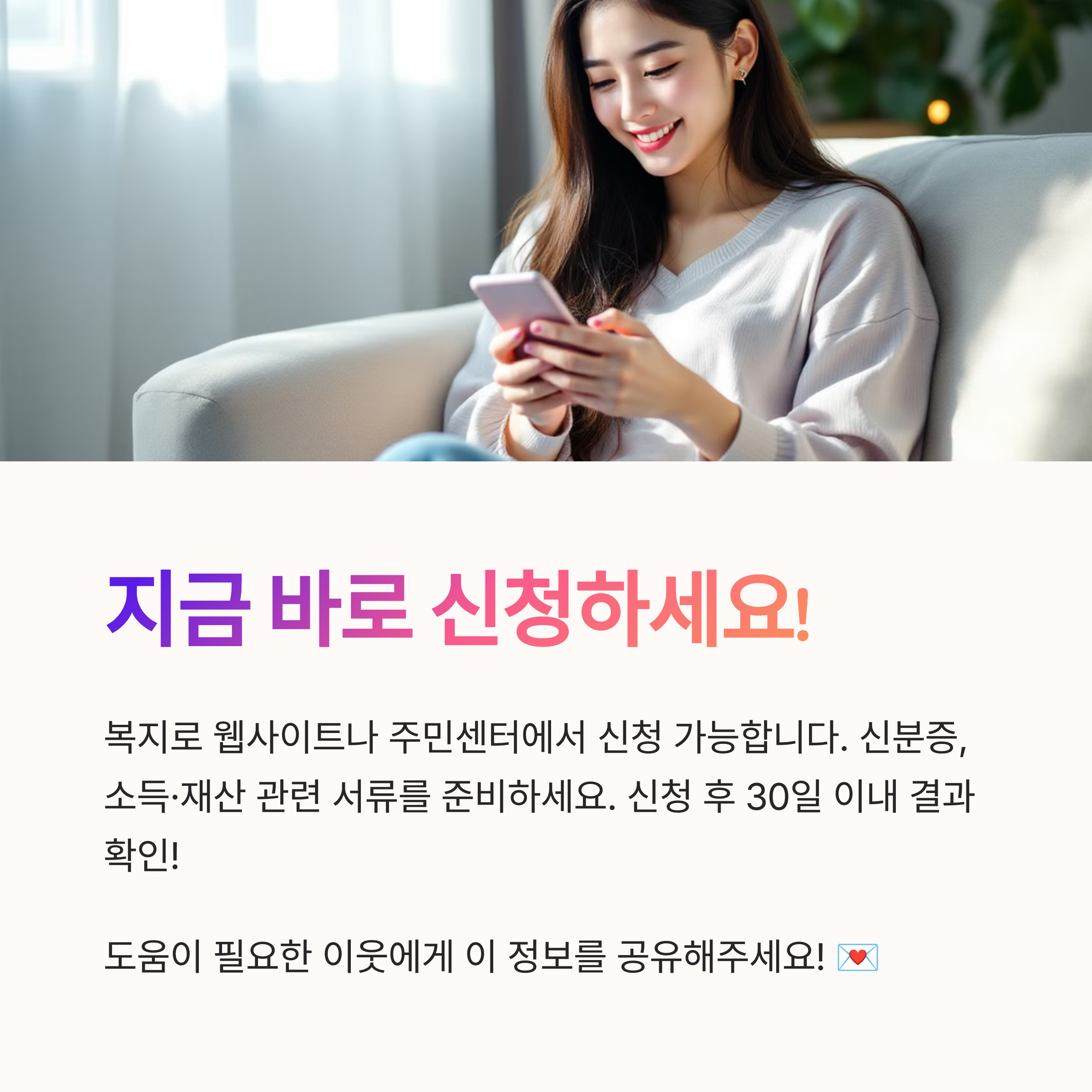 복지로에서 간단히 확인하고, 주민센터에 신청하면 됩니다. 신청하신 분들, 어떤 도움을 받았는지 댓글로 공유해 주시면 다른 분들에게도 큰 도움이 될 거예요~ 다음엔 또 유익한 정보로 찾아올게요!
